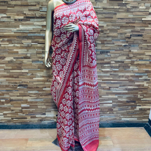 Explore in english - 100% Pure Cotton Red Floral Print Tussar Saree