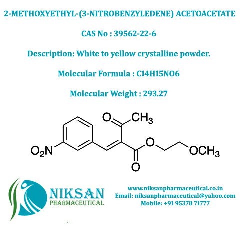 | उपयोग | Niksan Pharmaceutical is a manufacturer, exporter and supplier of a wide range of 2-METHOXYETHYL-(3-NITROBENZYLEDENE) ACETOACETATE. It’s mainly use in manufacturing of Cilnidipine. With support of our QA/QC and Production team we offer 2000 MT of 2-METHOXYETHYL-(3-NITROBENZYLEDENE) ACETOACETATE (CILNIDIPINE INTERMEDIATE). Synonyms: SALOR-INT L133884-1EA; 2-Methoxyethyl 2-[(3-nitrophenyl);methoxyethyl 3-nitrobenzylidenacetoacetate; METHOXYRTHYL-3-NITROBENZYLIDENACETOACETATE; (Z)-2-METHOXYETHYL 2-BENZYLIDENE-3-OXOBUTANOATE; 2-Methoxyethyl-2-(3-nitrobenzyliden)acetoacetate; 2-METHOXYETHYL 2-(3-NITROBENZYLIDENE)ACETOACETATE; 2-Methoxyethyl 2-(M-Nitrobenzylidene)acetoacetate; 3-NITROBENZYLIDENEACETOACETATE-2-METHOXYETHYLESTER; 2-Methoxyethyl 2-(3-nitrobenzylidene)-3-oxobutanoate. Specifications :- Chemical Name : 2-METHOXYETHYL-(3-NITROBENZYLEDENE) ACETOACETATE CAS No : 39562-22-6 Description: White to yellow crystalline powder. Molecular Formula : C14H15NO6 Molecular Weight : 293.27 Purity : ≥98 % Assay : ≥98 % Application: Used in Cilnidipine |