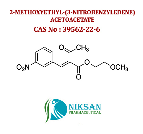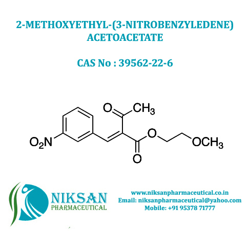 | सामग्रियां | Niksan pharmaceutical is manufacturer and exporter, supplier and distributor of 2-Methoxyethyl-(3-Nitrobenzyledene) Acetoacetate from many years in a field of pharmaceutics and healthcare industries. |