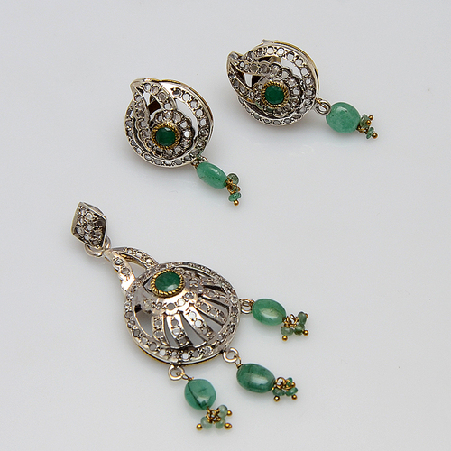 Explore in english - 925 sterling silver Emerald & Cz Gemstone Victorian Pendant Set