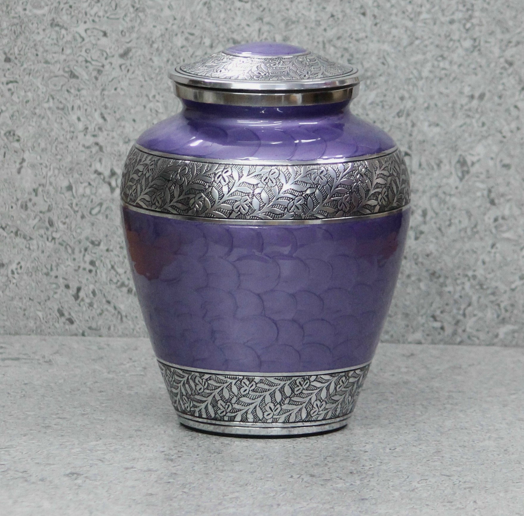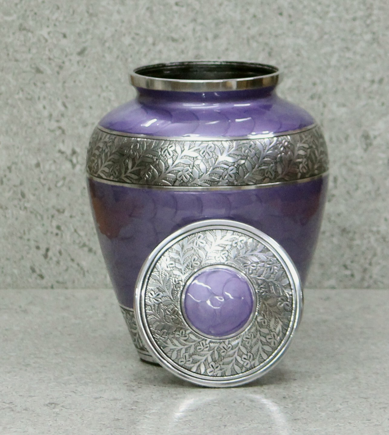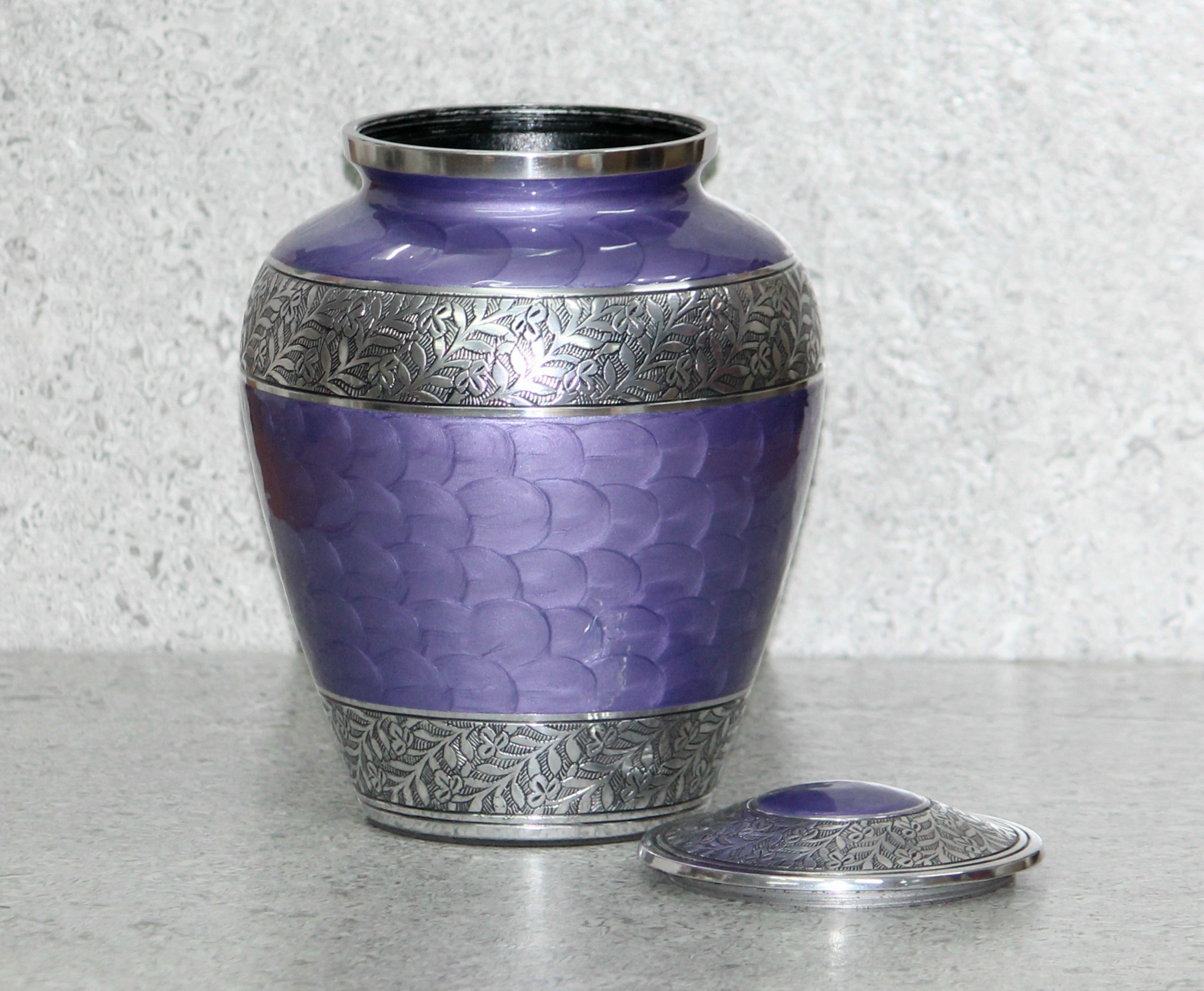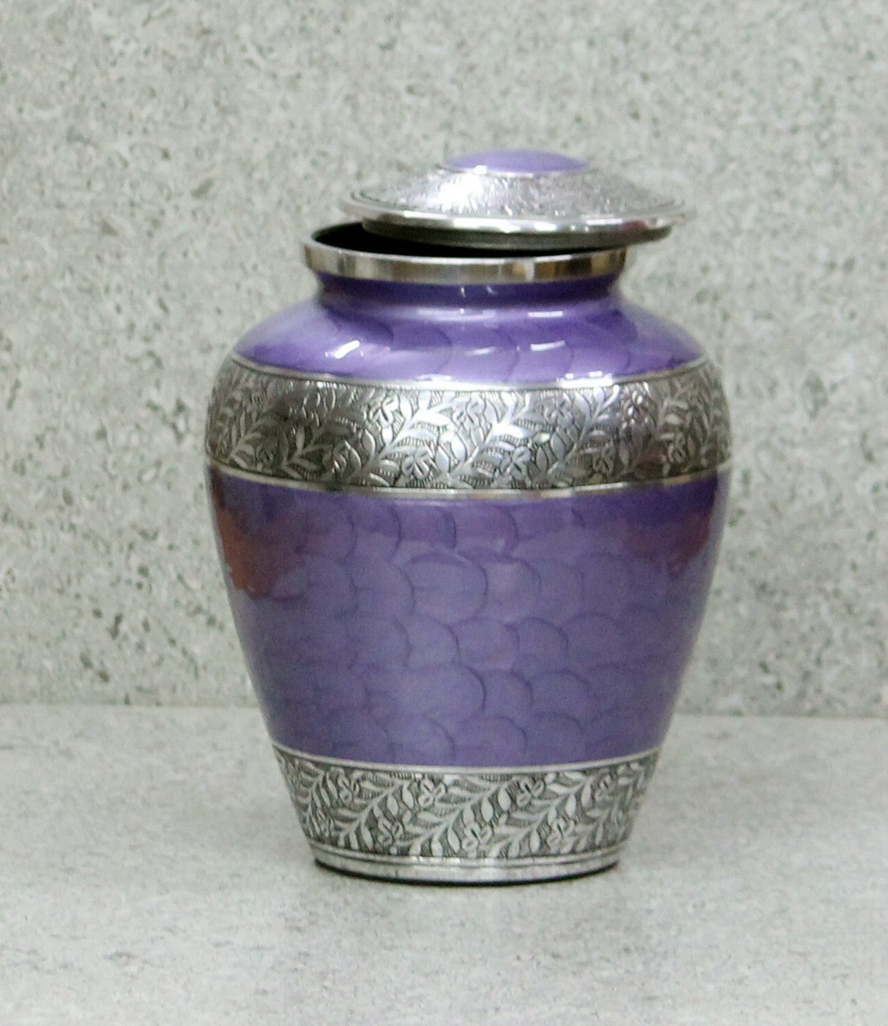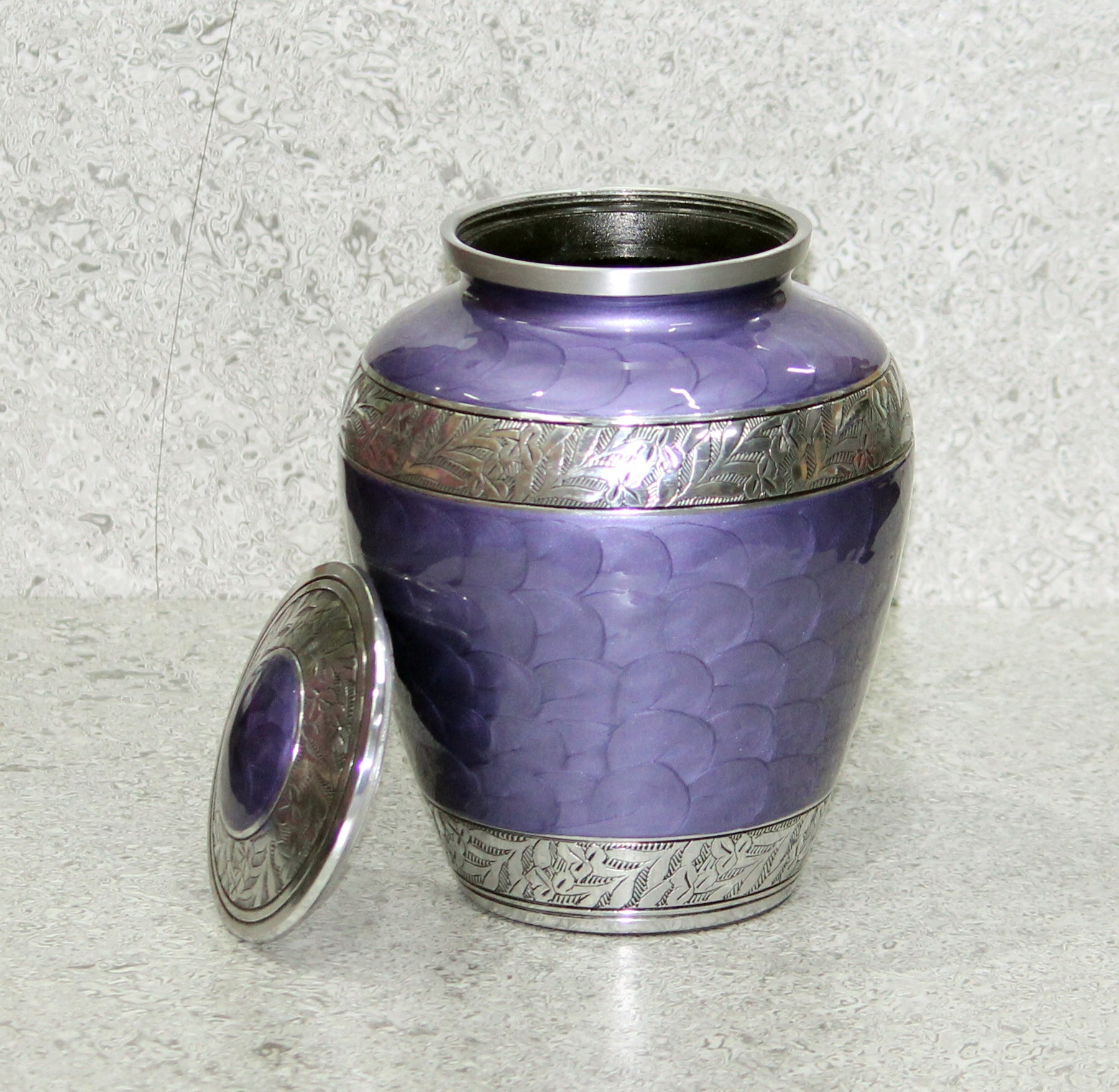 उत्कीर्णन बैंड के साथ बैंगनी एल्यूमीनियम श्मशान कलश