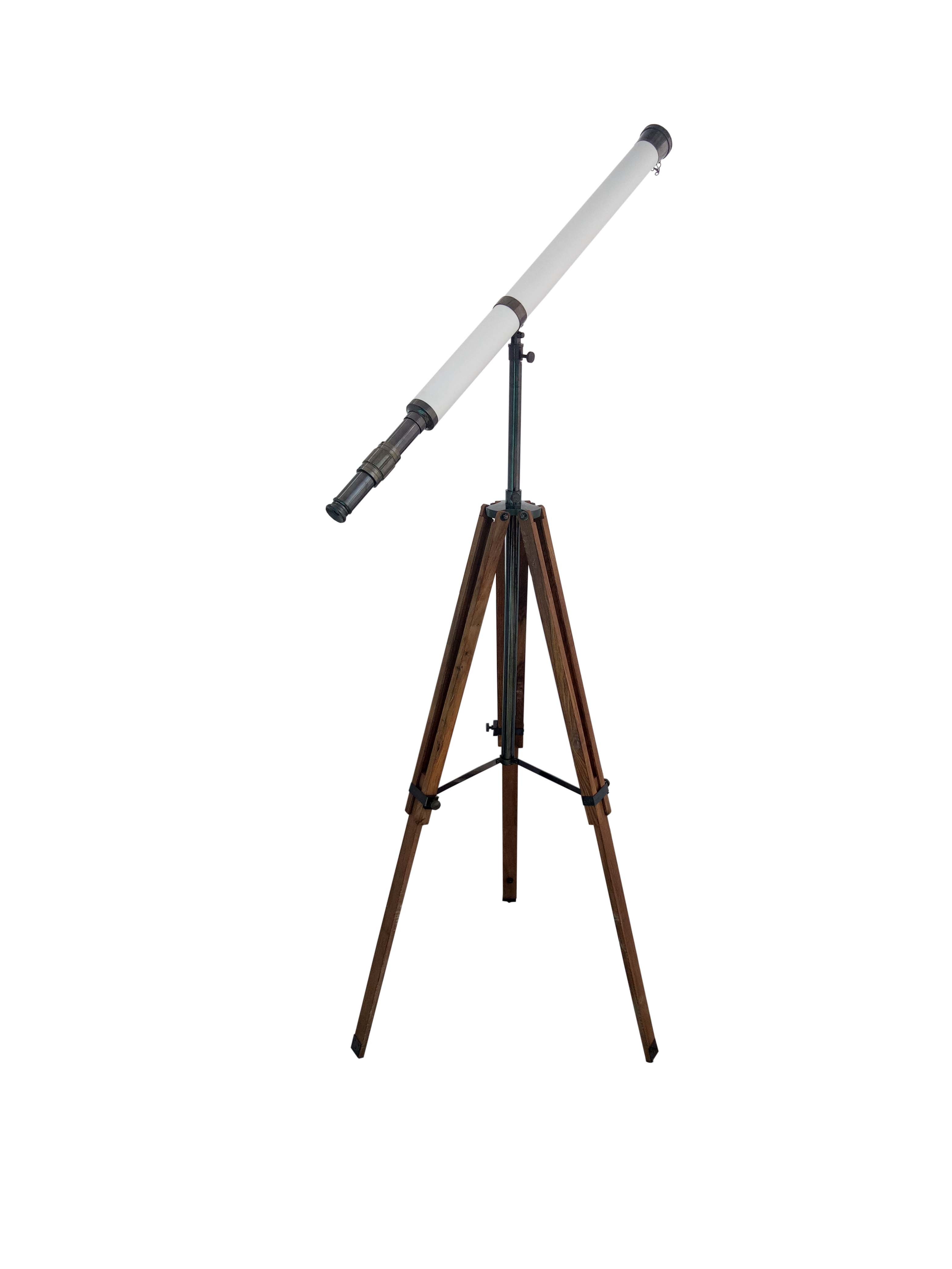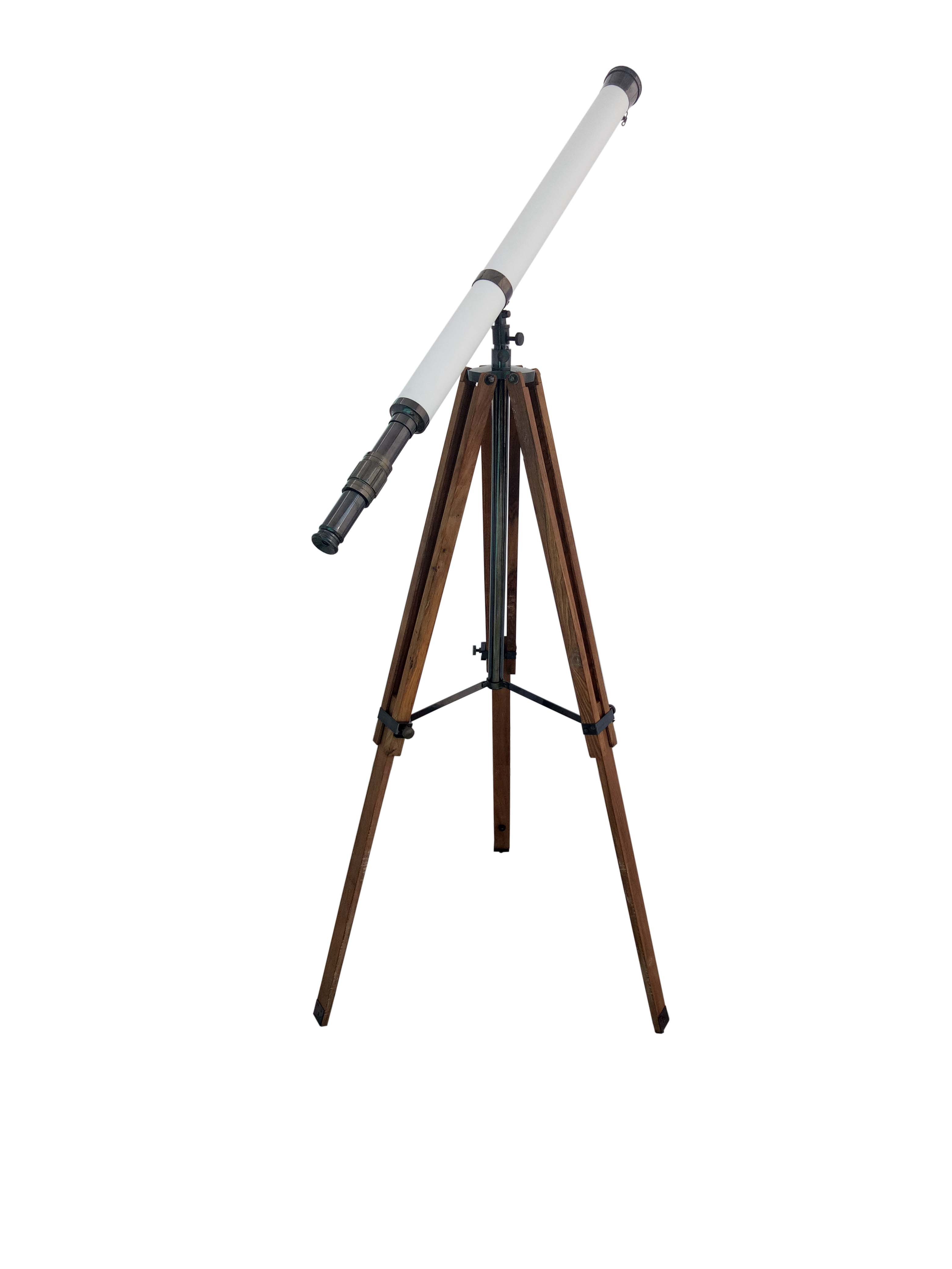 सफेद चमड़े और लकड़ी के स्टैंड के साथ प्राचीन पीतल का टेलीस्कोप आवर्धन: 42 X