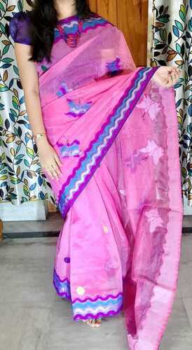 Explore in english - Applique work on Chanderi border on pink kota saree