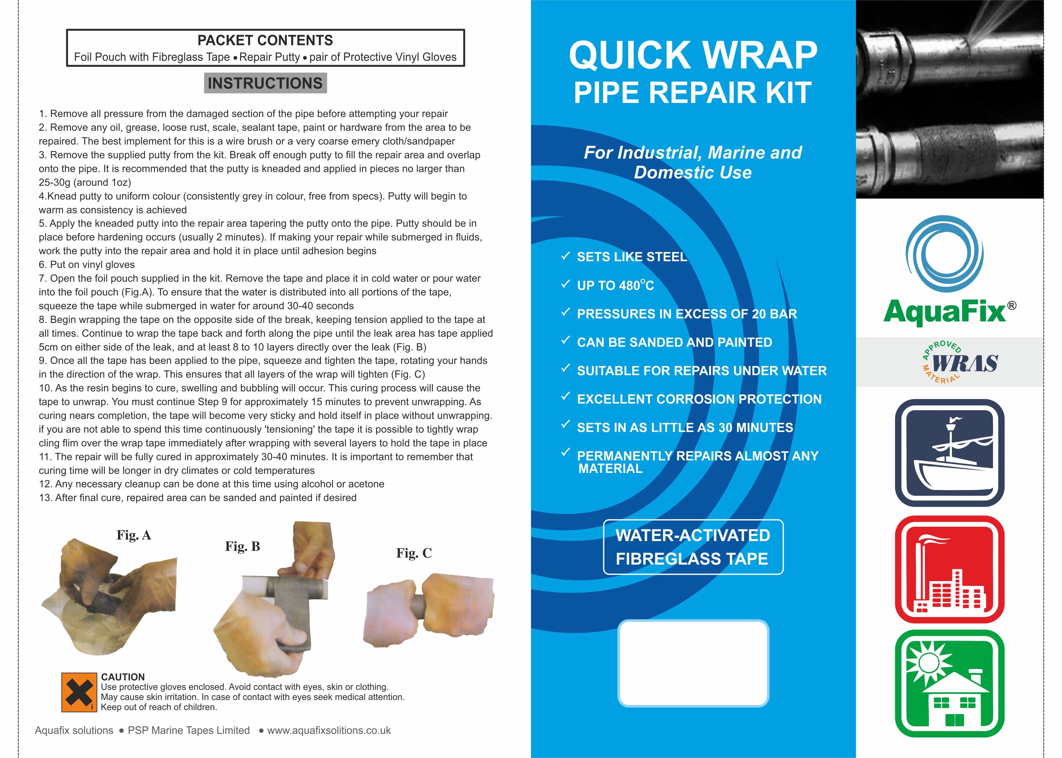 | एप्लीकेशन | For Online Leak Sealing of Pipes, Aquafix PIpe Leak repair kit Sets like Steel. Works upto 480 Deg. C. Can withstand a Working Pressure of 20 Bar. Suitable for Underwater applications. Has Excellent Corrosion Resistance. Sets within 30 minutes. Ensures a permanent Leak free repair Aquafix Pipe WRAP REPAIR Kit can be considered a permanent or temporary fix. It has the versatility to be used on sensitive repairs such as potable water lines as well as the strength to be used on petroleum and chemical lines. Aquafix WRAP PIPE REPAIR KIT not only makes repairs above ground, it even works under water, in fresh or saltwater. Aquafix WRAP PIPE REPAIR KIT not only keeps fluids from leaking, it also keeps fluids from penetrating a wrapped area. This allows for corrosion prevention, asbestos containment, sealing and waterproofing. |