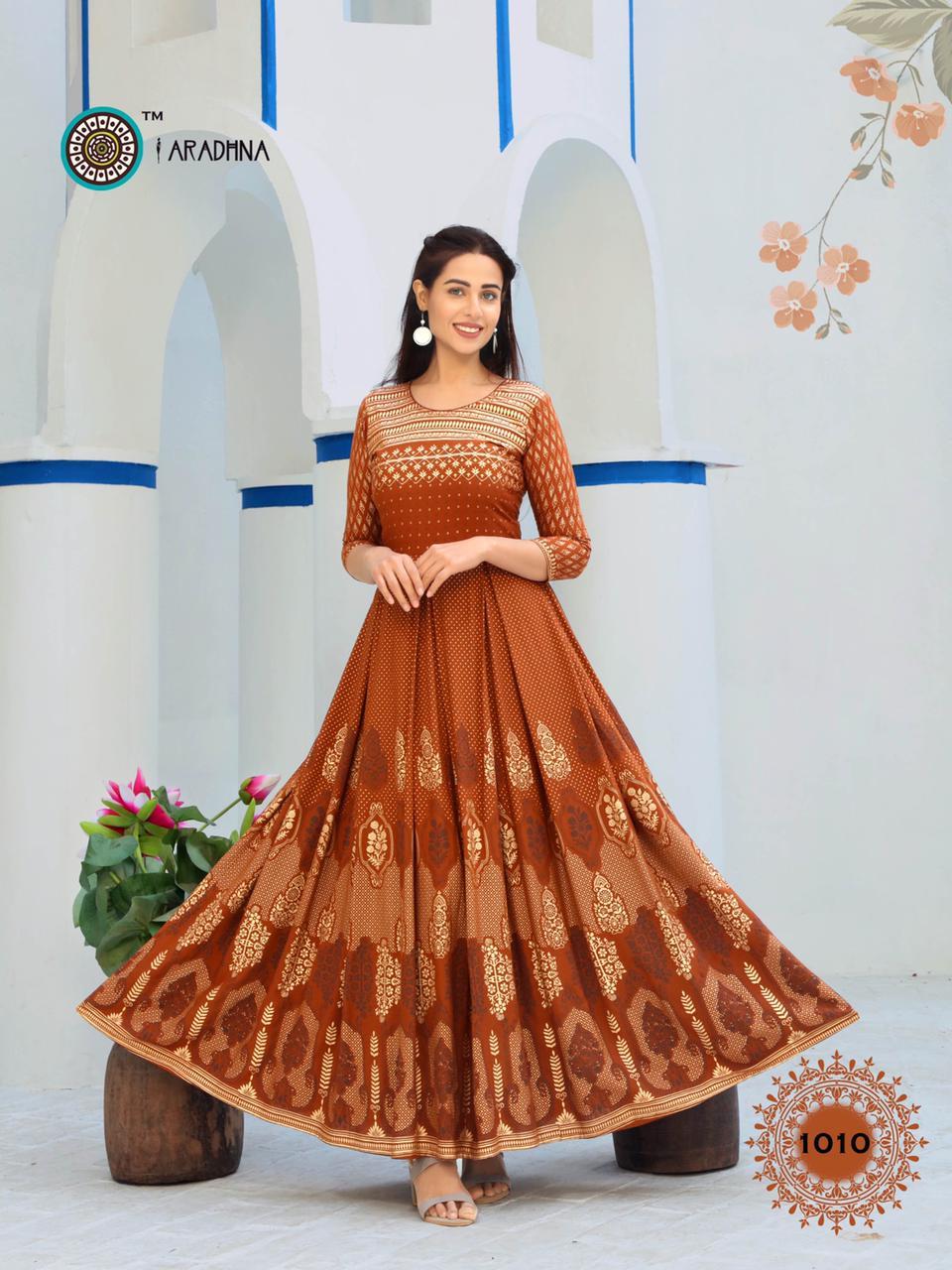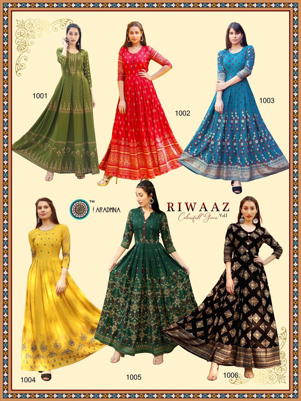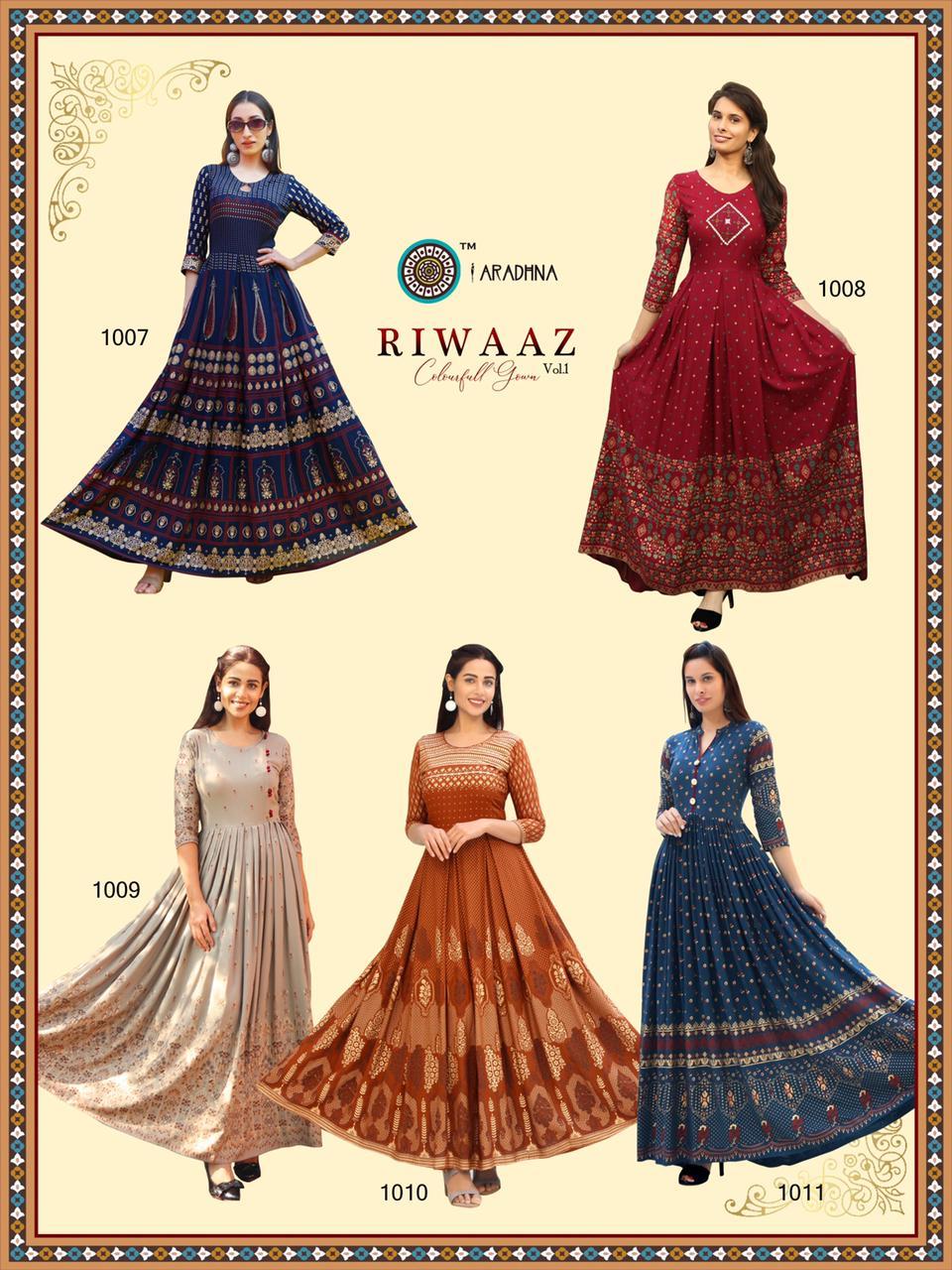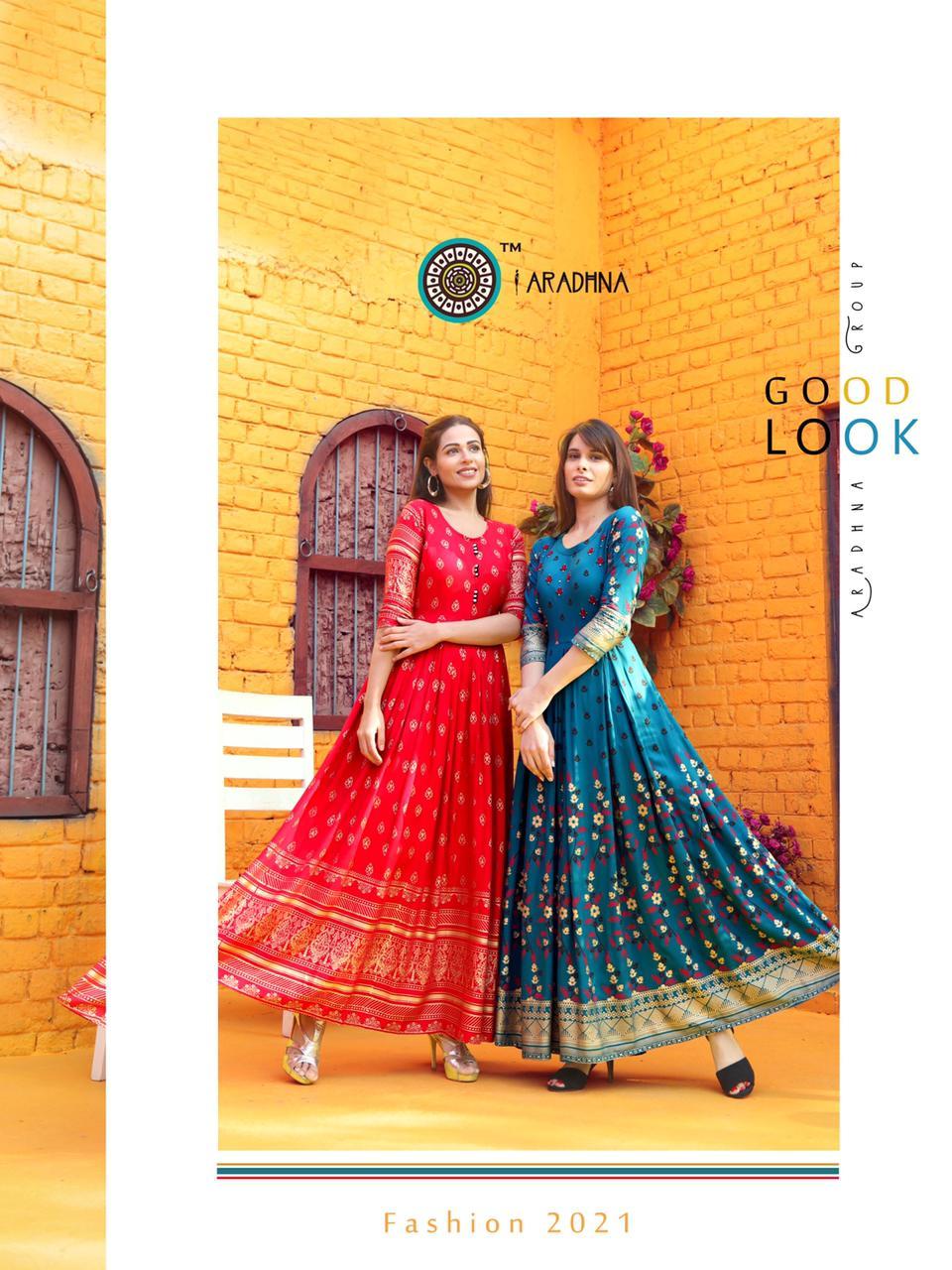 मल्टी कलर आराधना रिवाज़ वॉल्यूम 1 रेयॉन वर्क लॉन्ग कुर्ती कैटलॉग के साथ