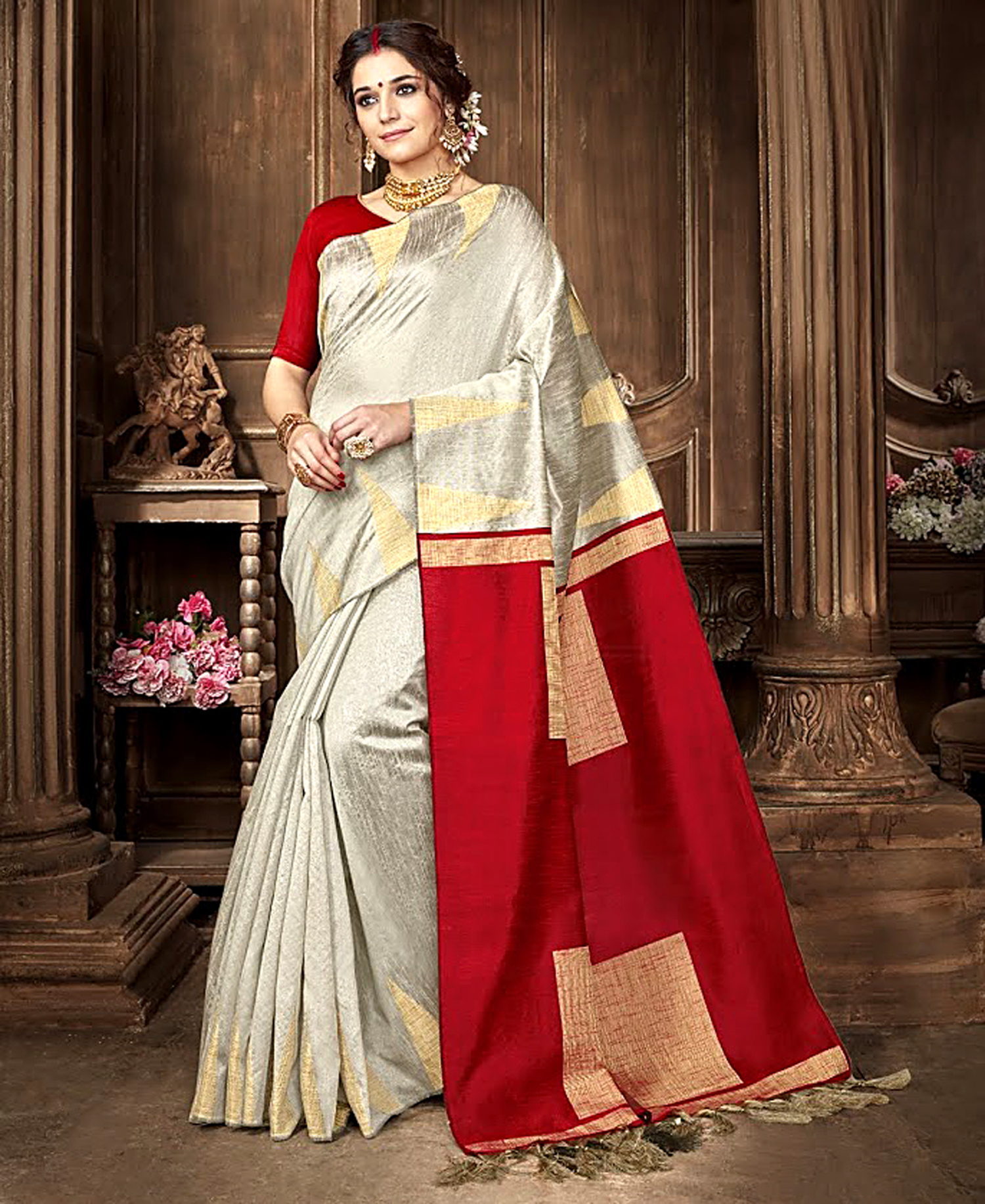 क्रीम रंग की महिलाओं की क्रश चिनोन साड़ी ब्लाउज़ और कमर बेल्ट के साथ