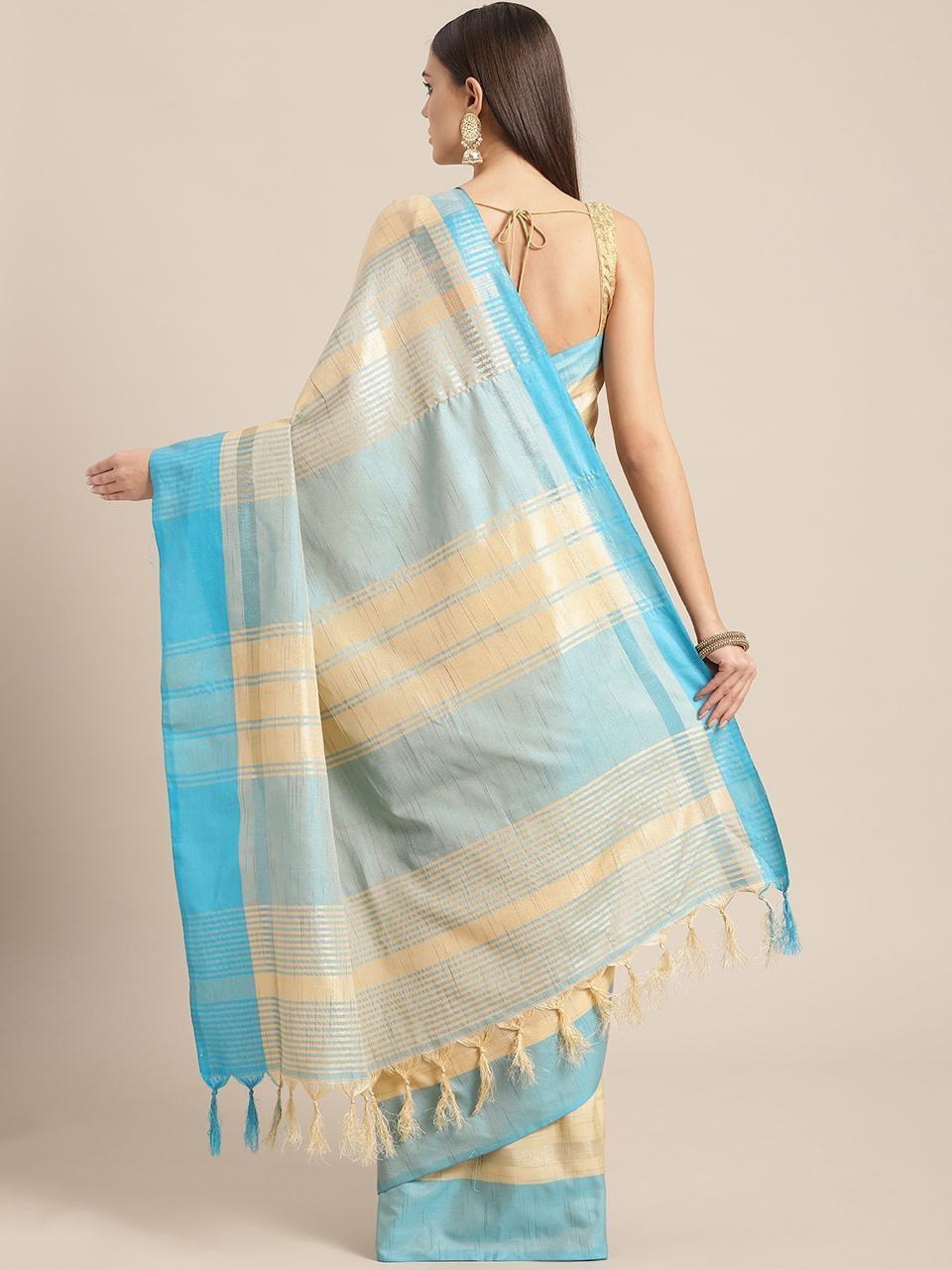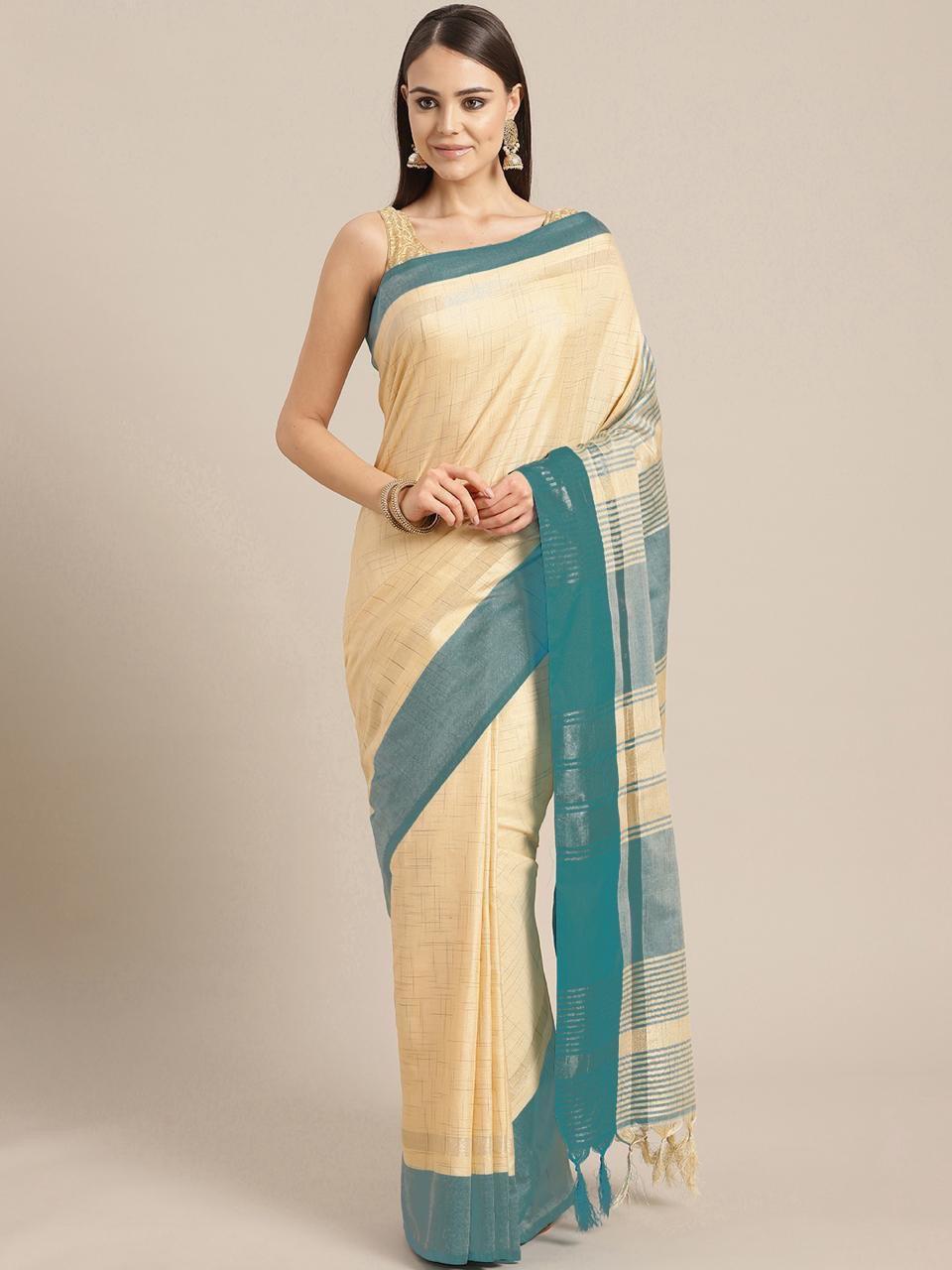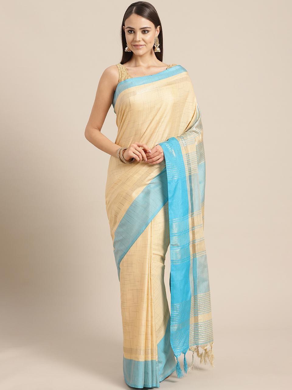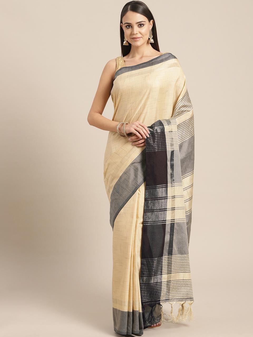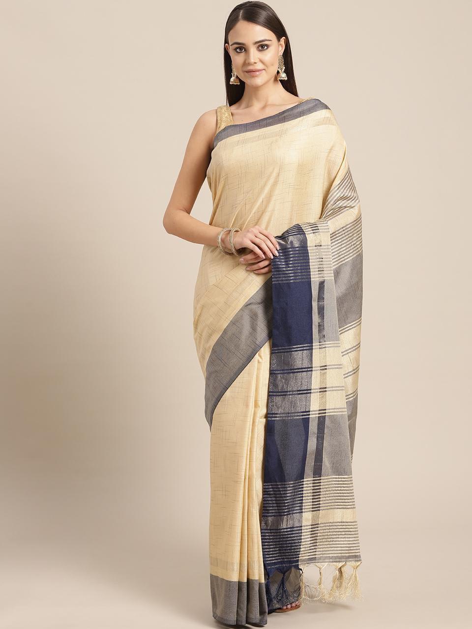 क्रीम रंग की महिलाओं की क्रश चिनोन साड़ी ब्लाउज़ और कमर बेल्ट के साथ