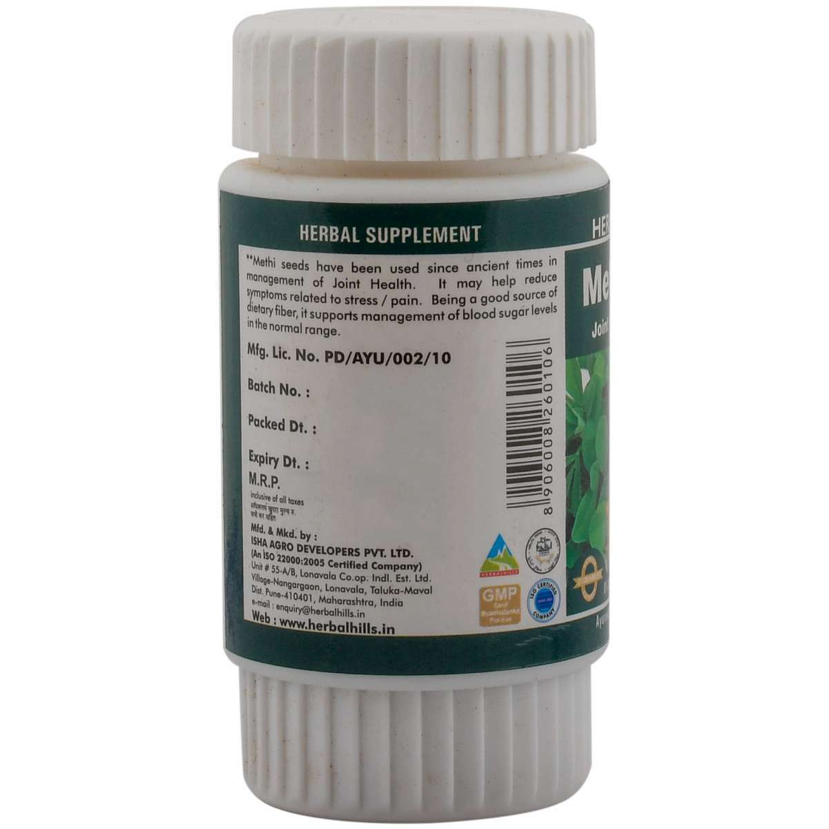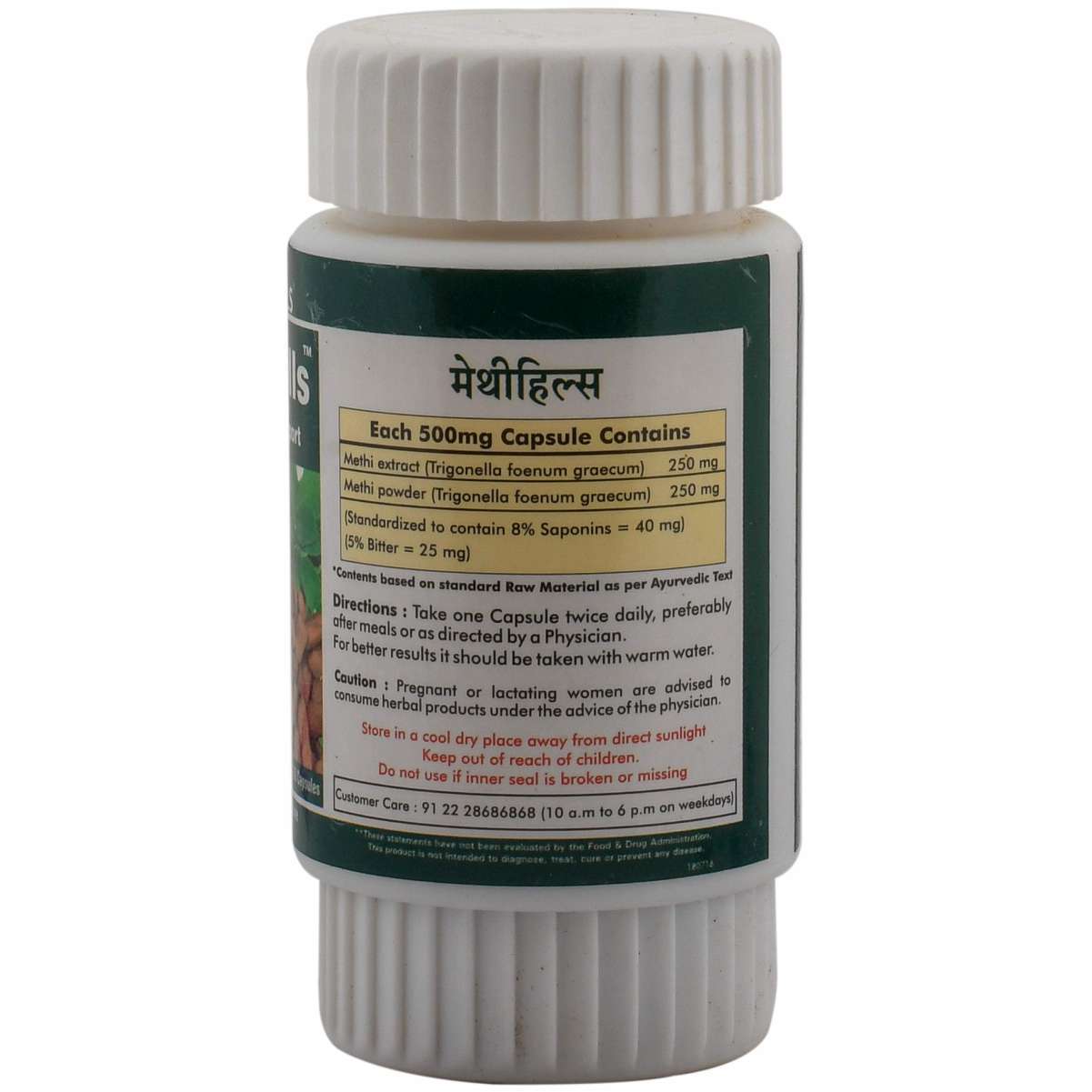 | सामग्रियां | Methihills (Methi) 500mg capsule is an Ayurvedic formulation of 250mg pure powder of Methi seeds and 250mg pure Methi seeds extract, contains active levels of Saponins & Bitters which has anti-inflammatory, antioxidant, antidiabetic, galactagogue properties. |