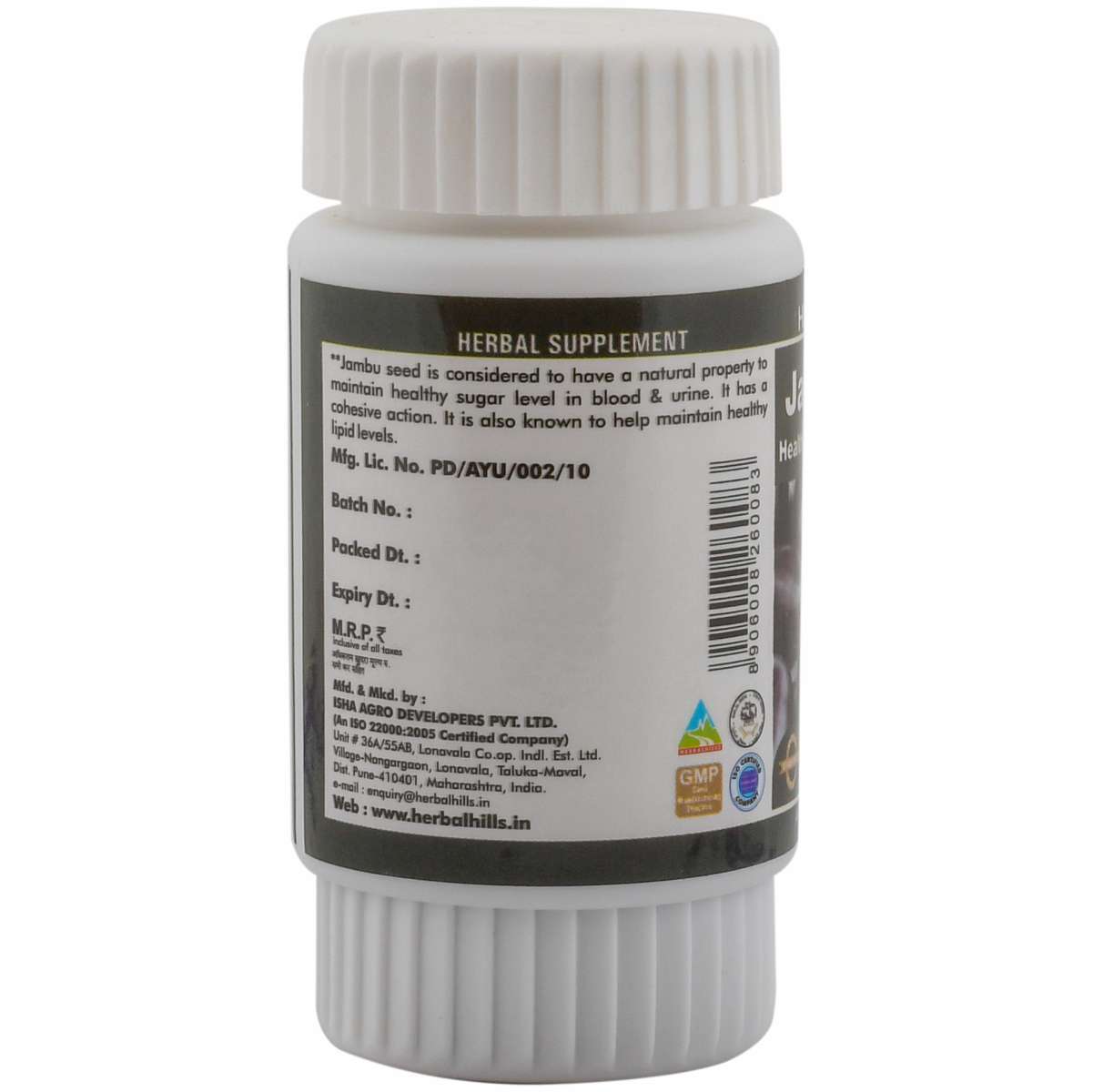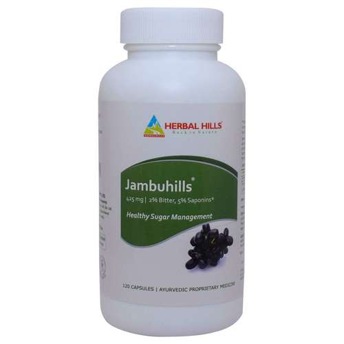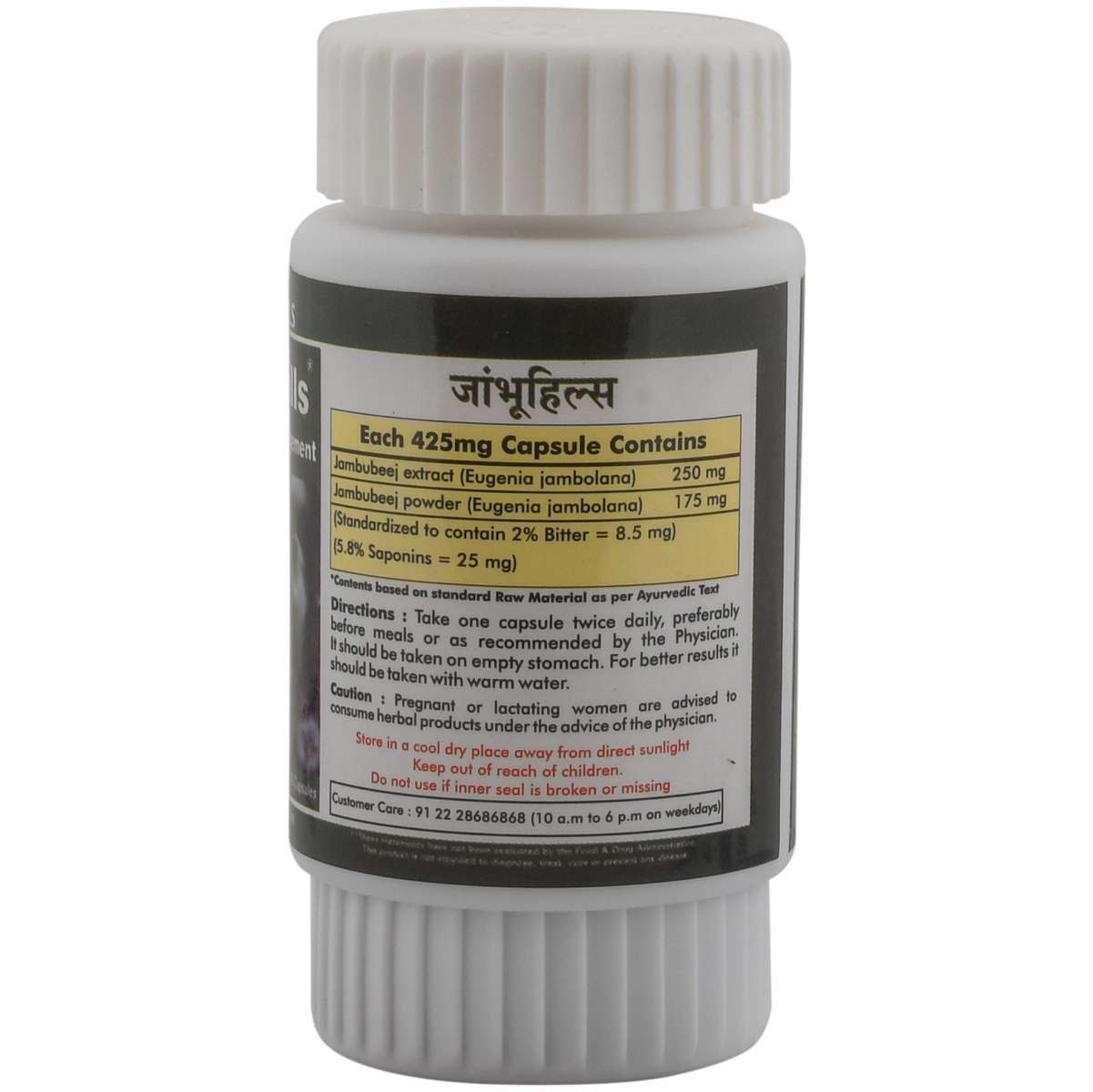 सामग्रियां | Jambuhills (Jamun seed) 425mg capsule is an Ayurvedic formulation of 175mg pure powder of Jambu seed and 250mg Pure Jambu seed extract, contains active levels of Bitters and Saponins which has carminative, anti-scorbutic and diuretic properties |