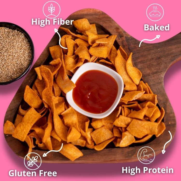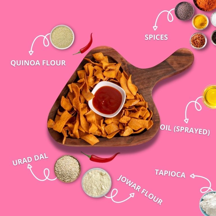 | सामग्रियां | Quinoa flour 60% urad dal flour 15% rice flour 5% tapioca startch 10% edible refined oil(sprayed to induce flavour) peri-peri seasoning salt & spices |