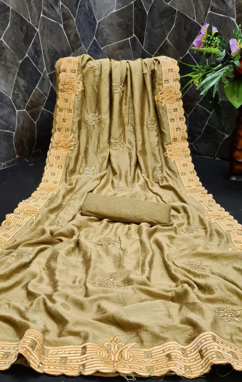 क्रीम रंग की महिलाओं की क्रश चिनोन साड़ी ब्लाउज़ और कमर बेल्ट के साथ