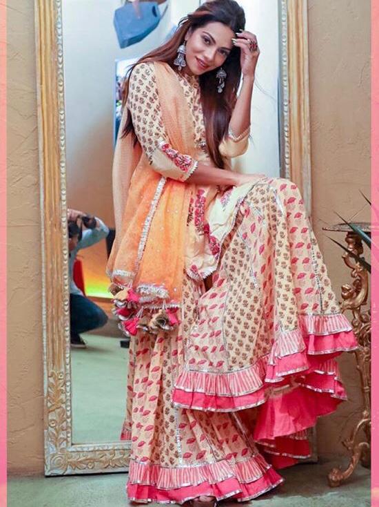 शरारा और दुपट्टे के साथ ऑरेंज ब्लॉक प्रिंट कुर्ता