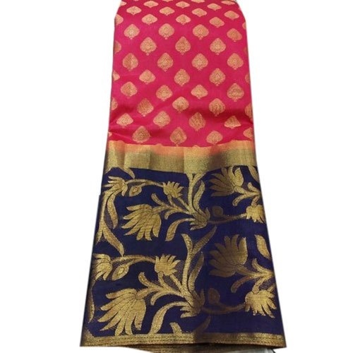 समर ब्लू और पिंक पार्टी वियर प्रिंटेड असम सिल्क लेडीज़ साड़ी ब्लाउज पीस सेट के साथ