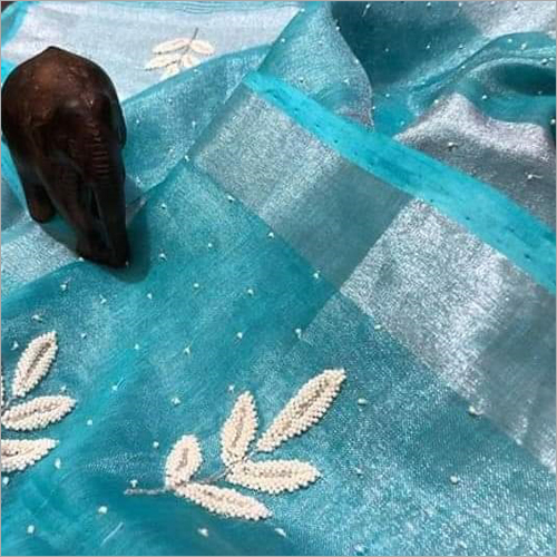 नीली एम्ब्रॉयडरी वाली बॉर्डर वाली साड़ी