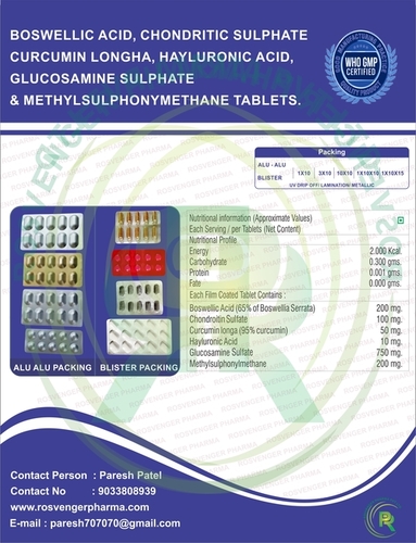 बोसवेलिया सेराटा, चोंड्रोटिन, करक्यूमिन, ग्लूकोसामाइन हायल्यूरोनिक और एमएसएम टैबलेट।