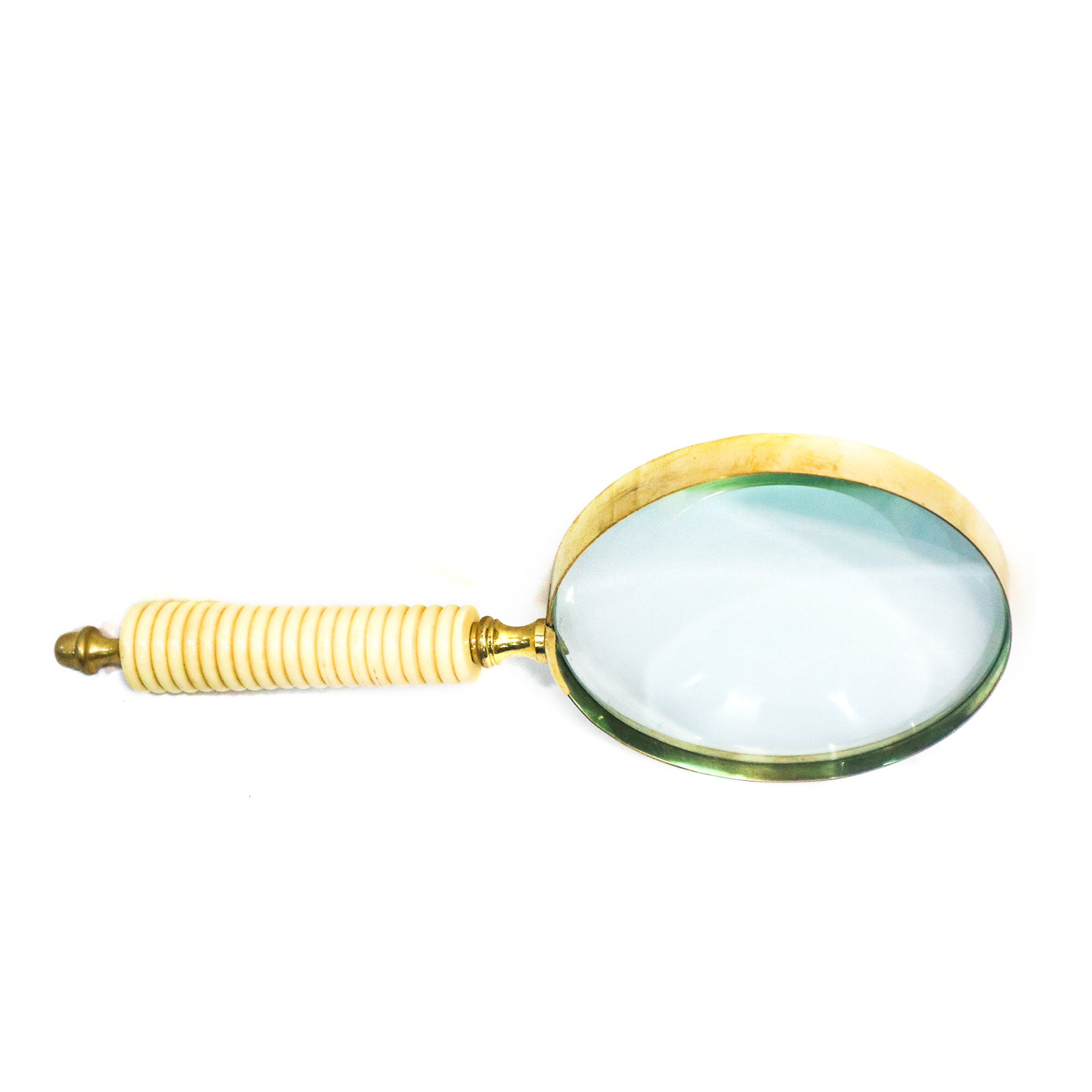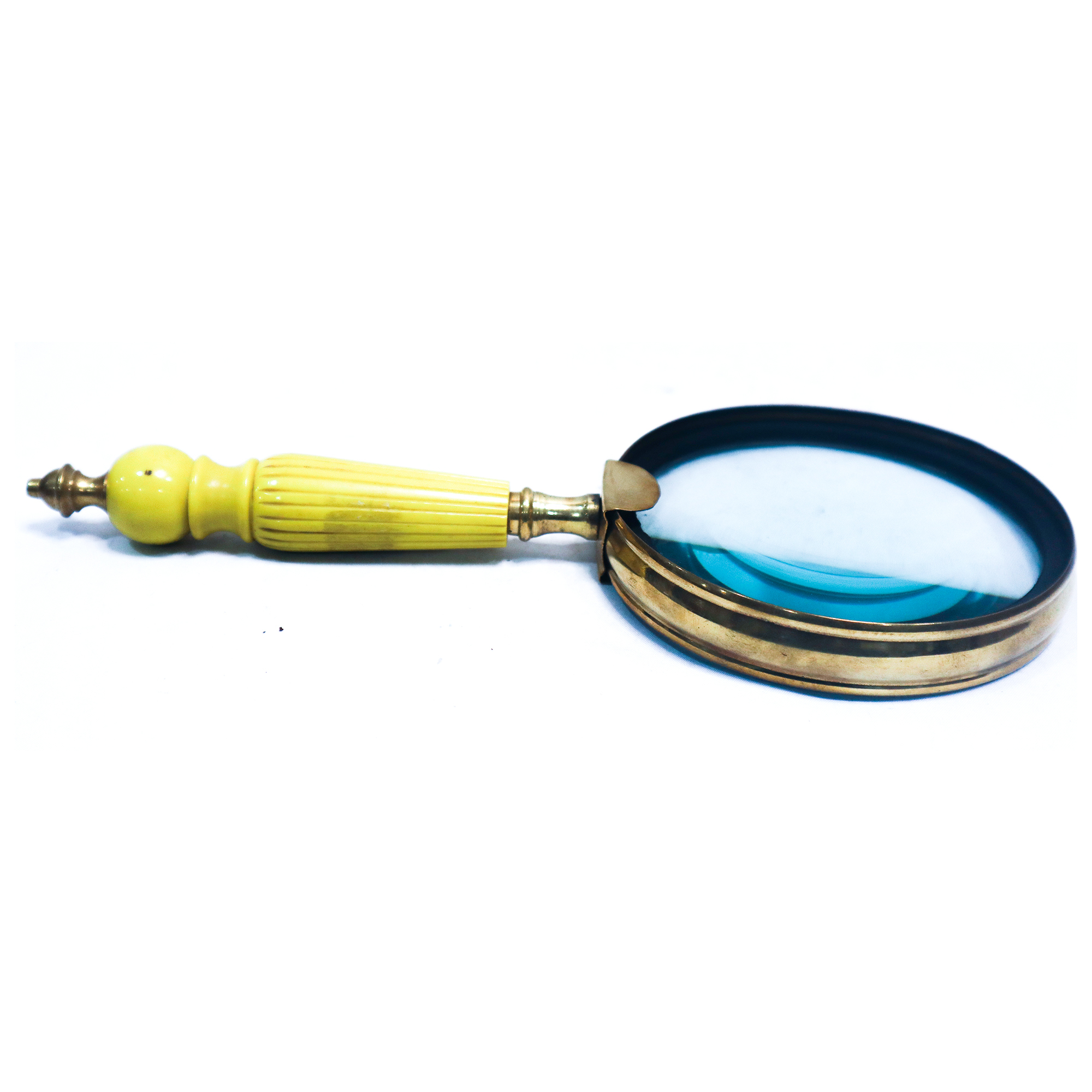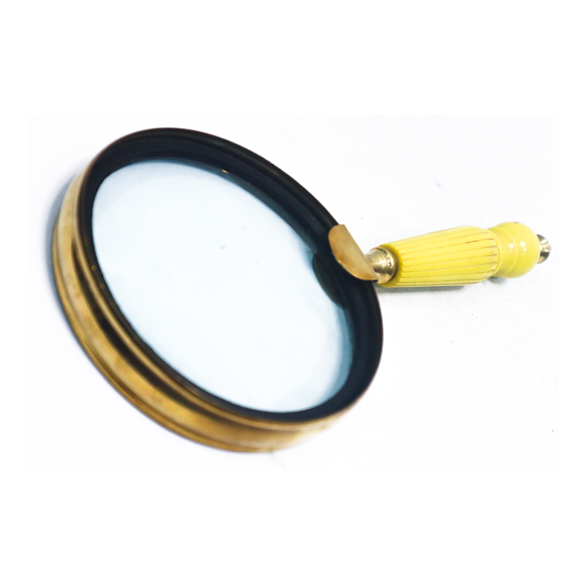 पीले हैंडल के साथ हस्तनिर्मित पीतल का आवर्धक कांच