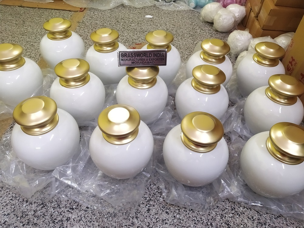 सुनहरे कलश अंतिम संस्कार की आपूर्ति के साथ पीतल सफेद चमक रहा है