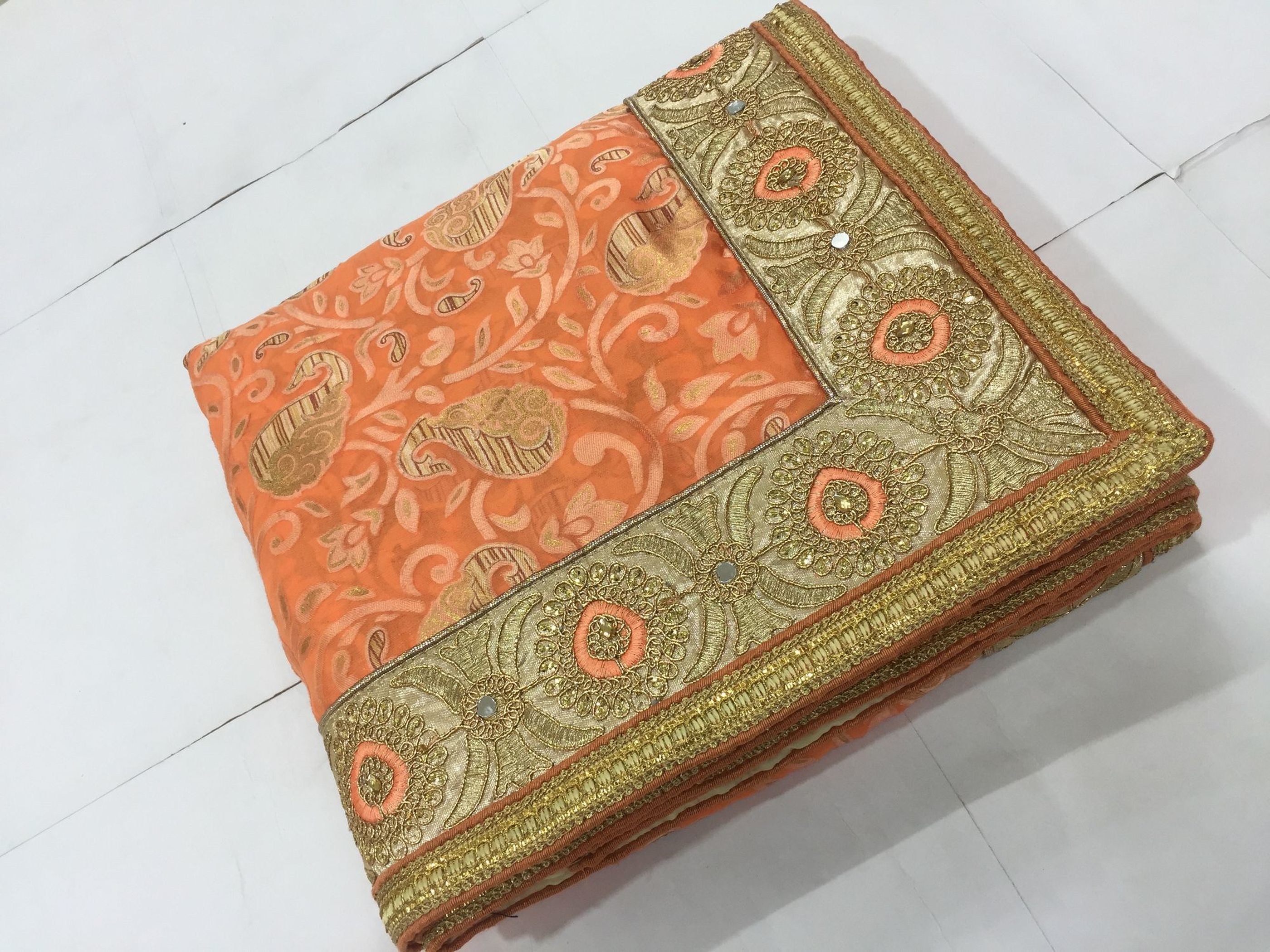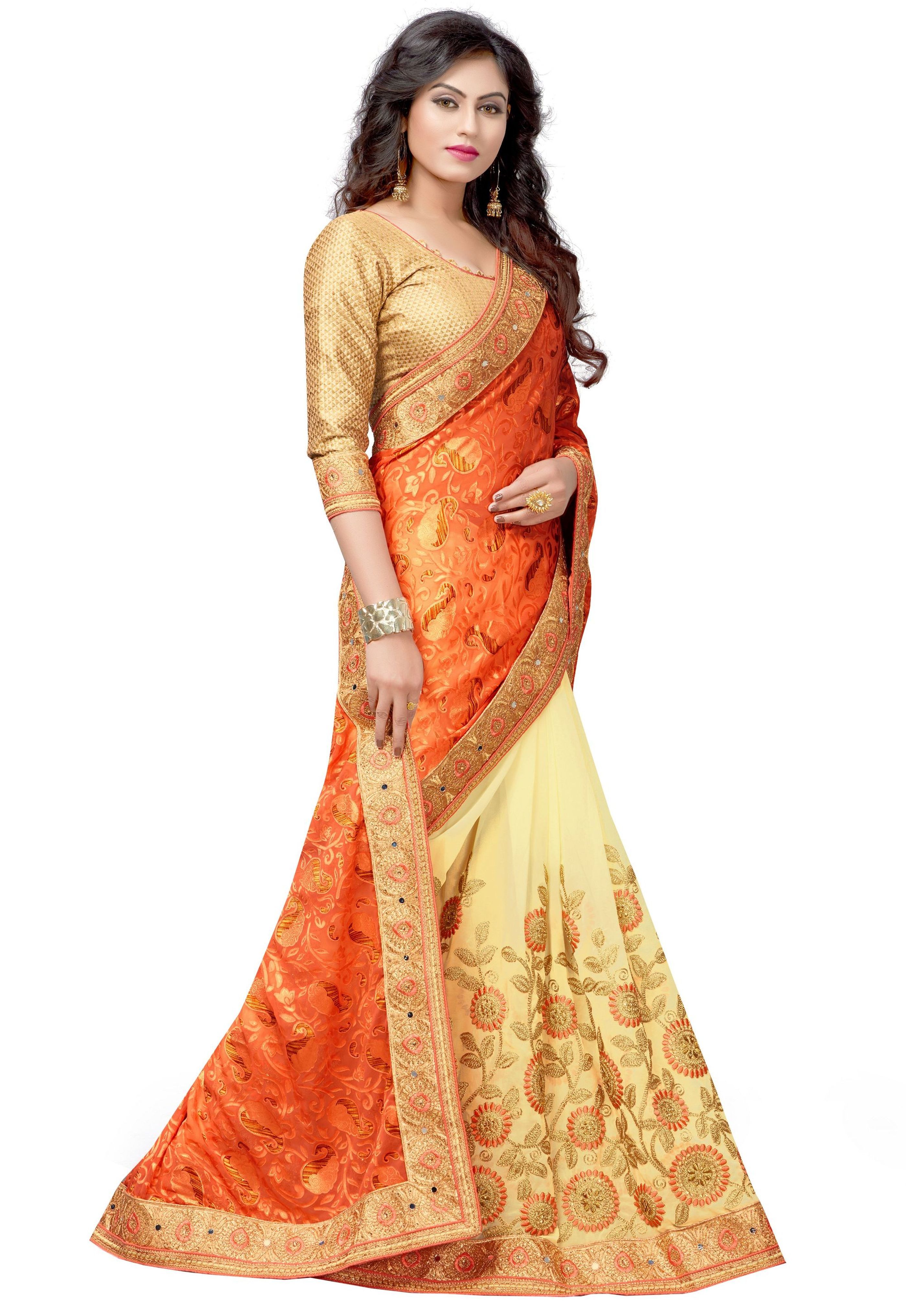 ऑरेंज ब्रासो और जॉर्जेट मिरर एम्ब्रायडरी वर्क, हाफ एंड हाफ साड़ी