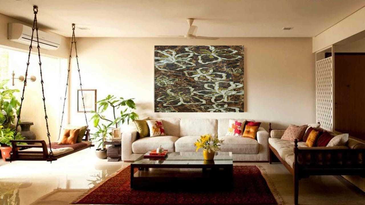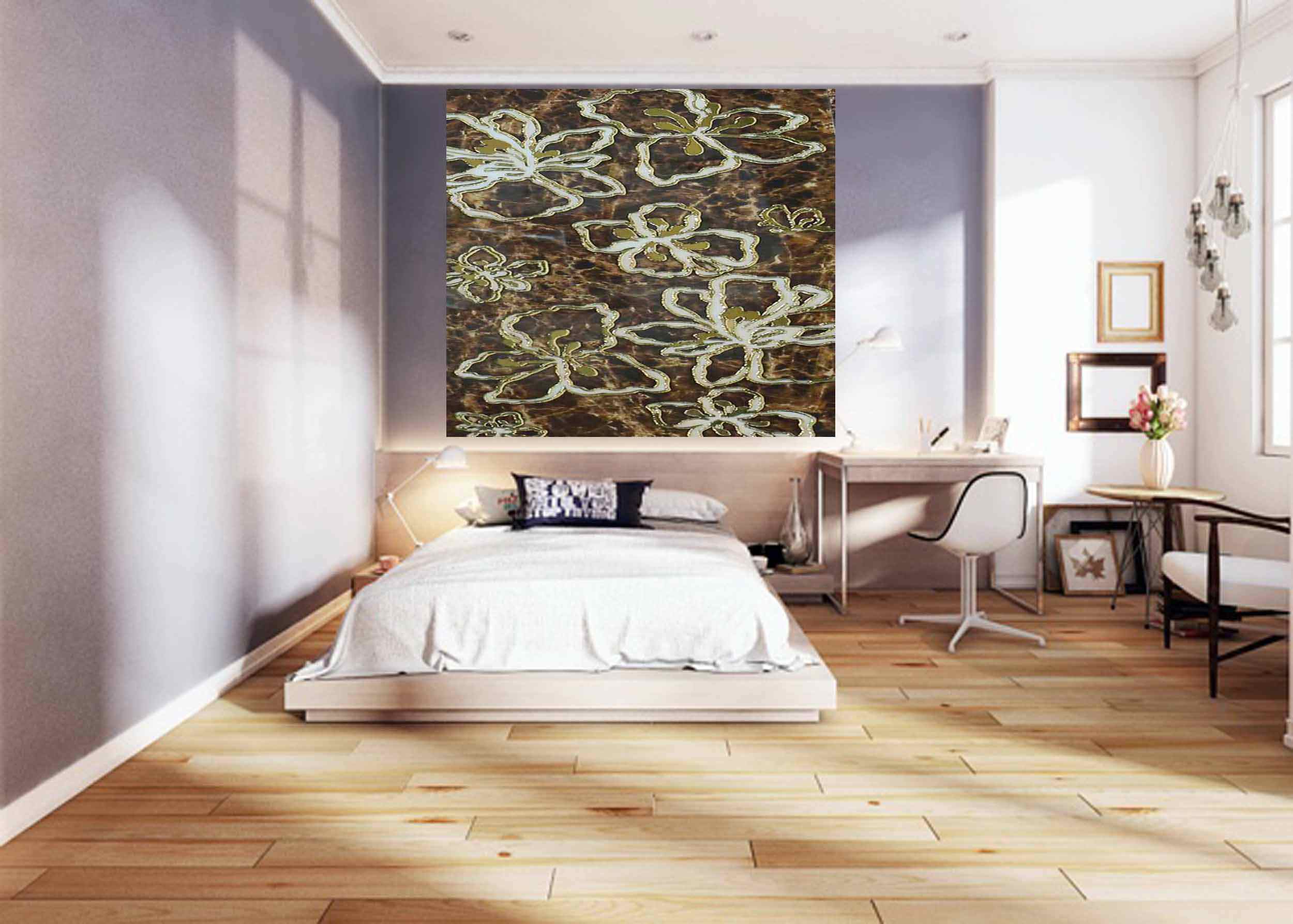 हस्तनिर्मित टाइल के साथ सुनहरे फूलों के साथ भूरे रंग की टाइलें