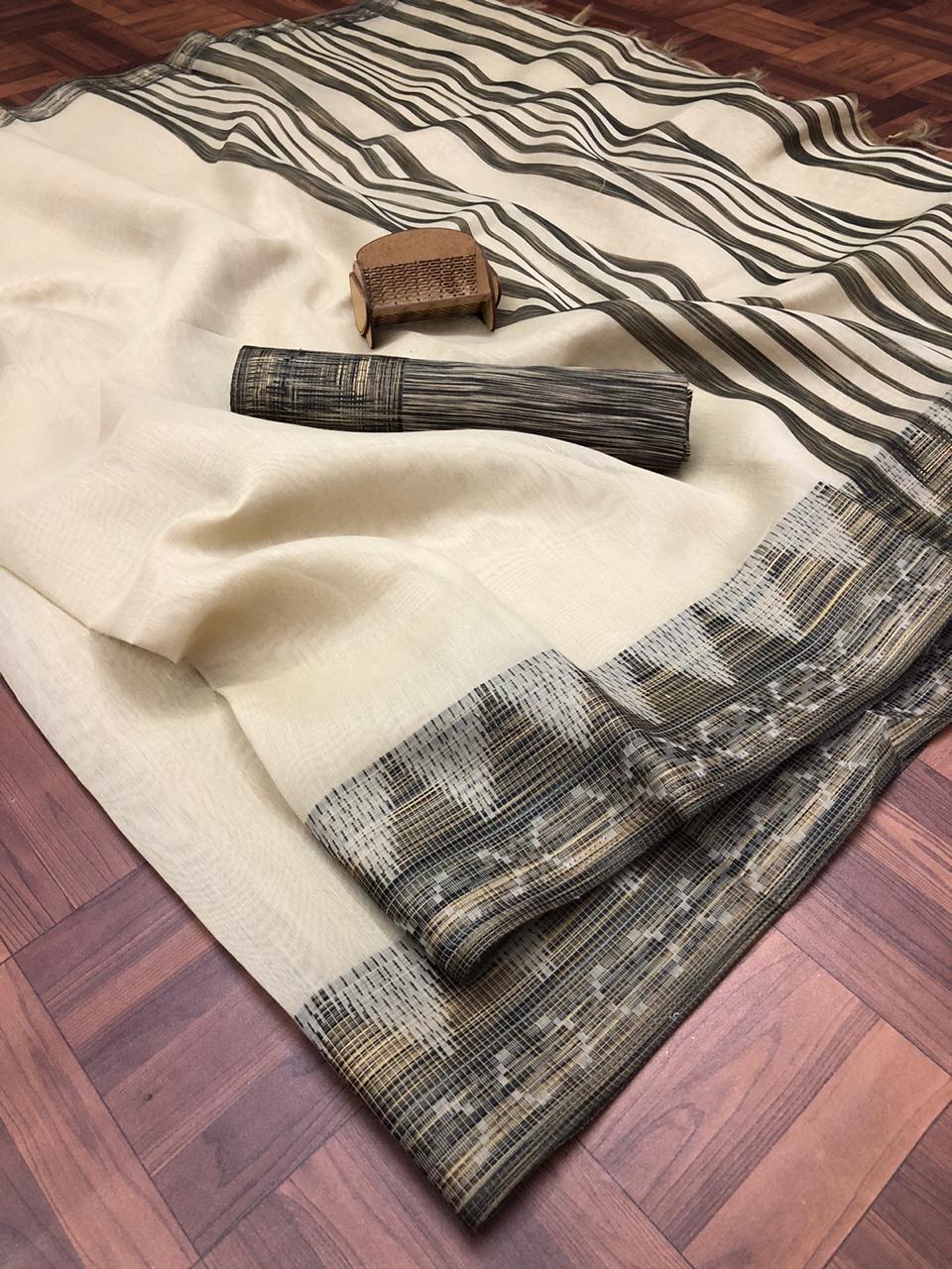 क्रीम रंग की महिलाओं की क्रश चिनोन साड़ी ब्लाउज़ और कमर बेल्ट के साथ