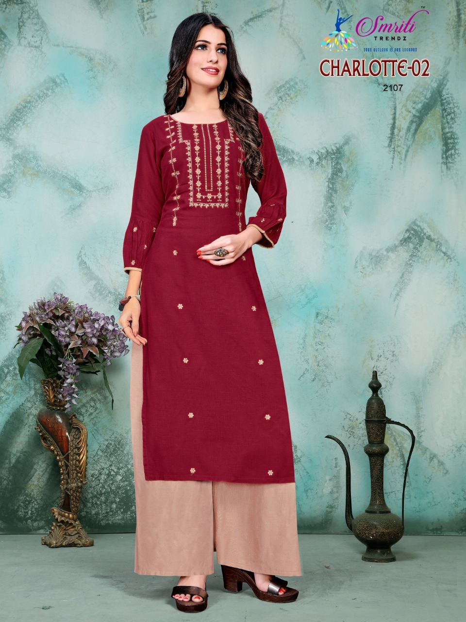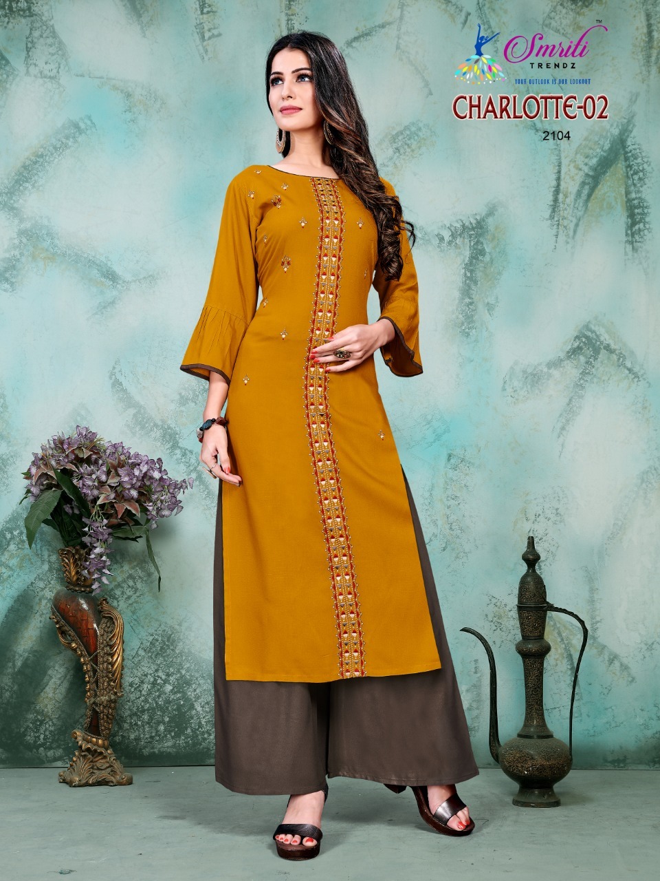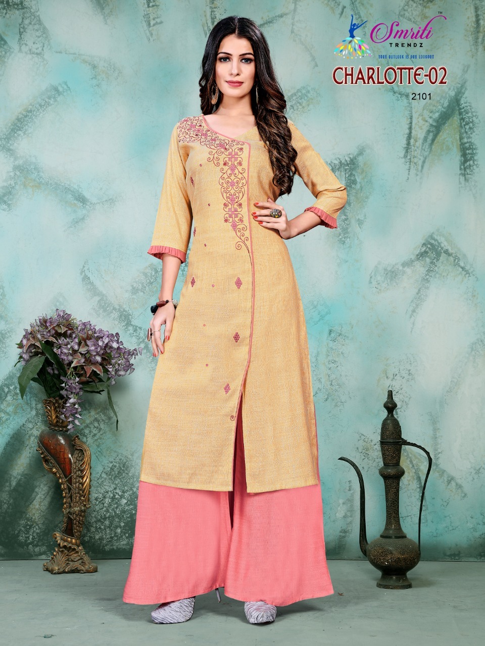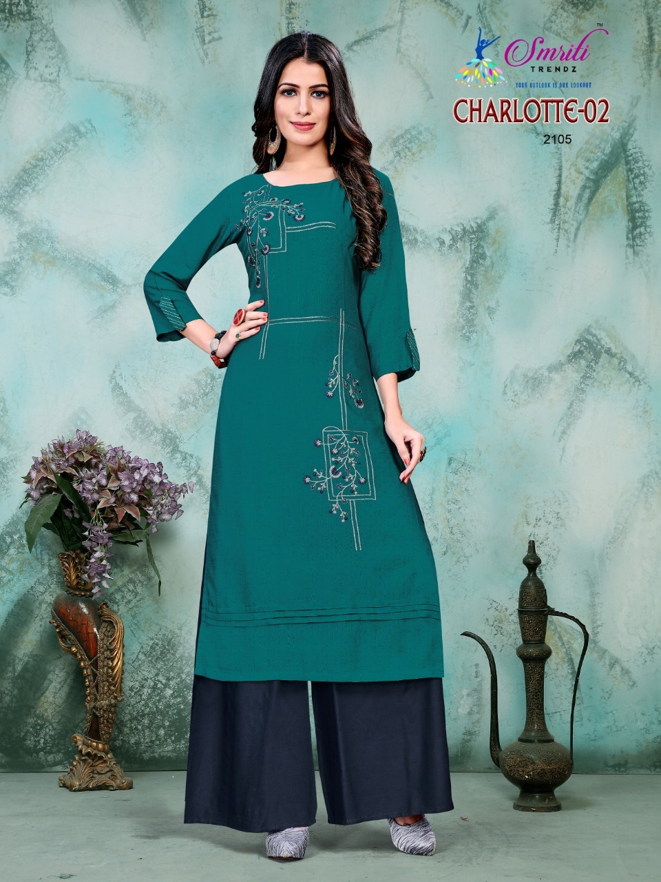 Explore in english - Charlotte 2 Designer Rayon Embroidered Kurtis And Plazzo