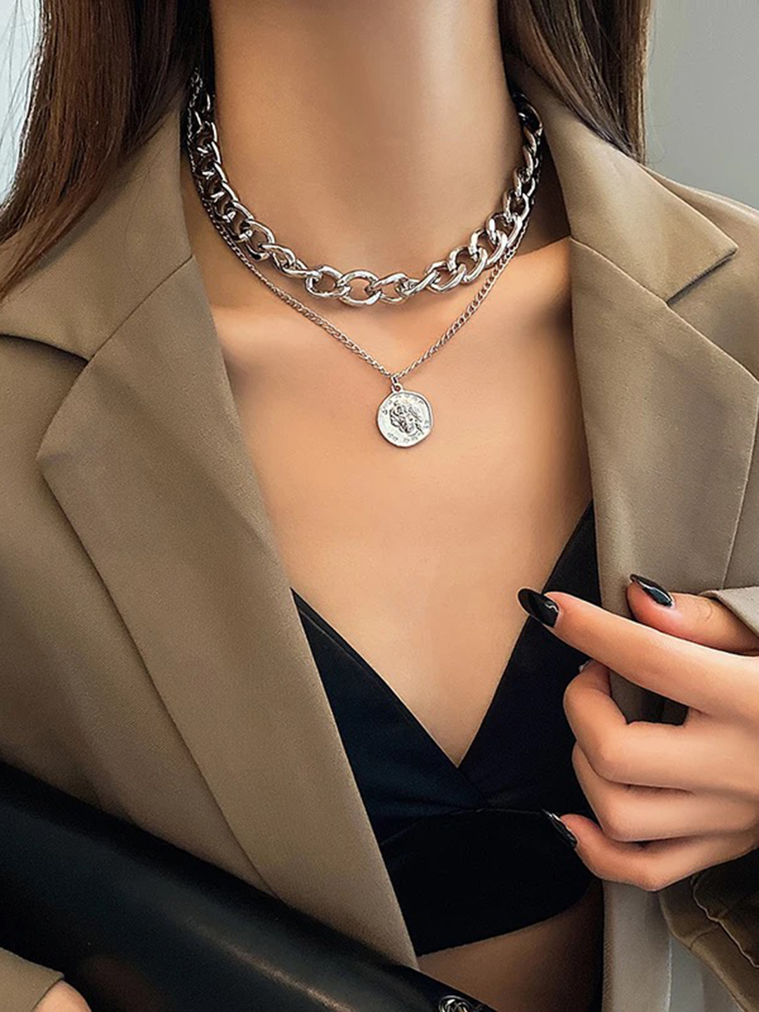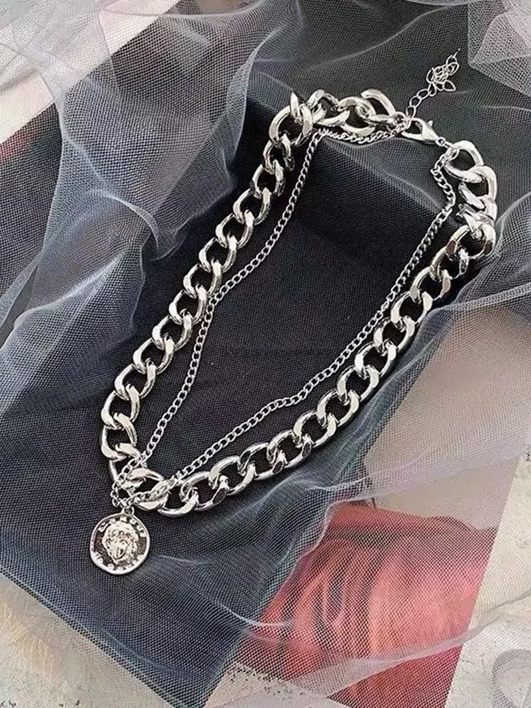 आकर्षक सिल्वर प्लेटेड डबल लेयर्ड विंटेज कॉइन पेंडेंट नेकलेस जेंडर: महिलाएं