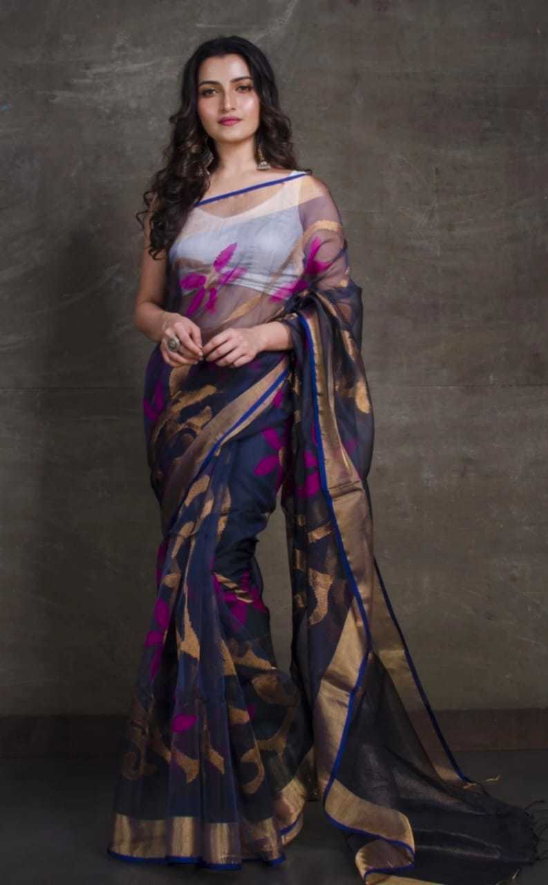 रसुम मोस्लिन जमदलनी साड़ी गोल्डन जरी स्काई ब्लू