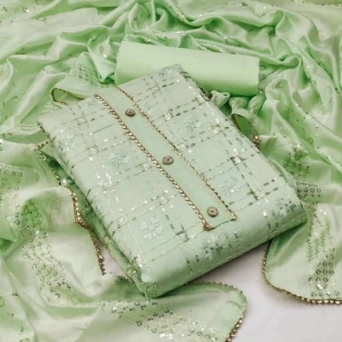 यह एक आरामदायक और हवा पार होने योग्य अनस्टिच्ड डिज़ाइनर कॉटन सूट है। यह टॉप, बॉटम और दुपट्टे के साथ आता है। सामग्री सूती है जिसमें कपड़े की सामग्री कपास और पॉलिएस्टर है। यह हल्के हरे रंग का पिस्ता रंग का सलवार सूट है। इसे किसी भी पैटर्न या स्टाइल में सिला जा सकता है। इस सलवार सूट को पूरे साल पहना जा सकता है। यह एक सुंदर एम्ब्रॉयडरी वाला सलवार सूट है। यह सलवार सूट जल्दी सूख जाता है और घर पर धोने के बाद फीका नहीं पड़ता है। यह एक एंटी-रिंकल सलवार सूट है। यह अवसरों और त्योहारों पर पहनने के लिए एक शानदार सूट है।