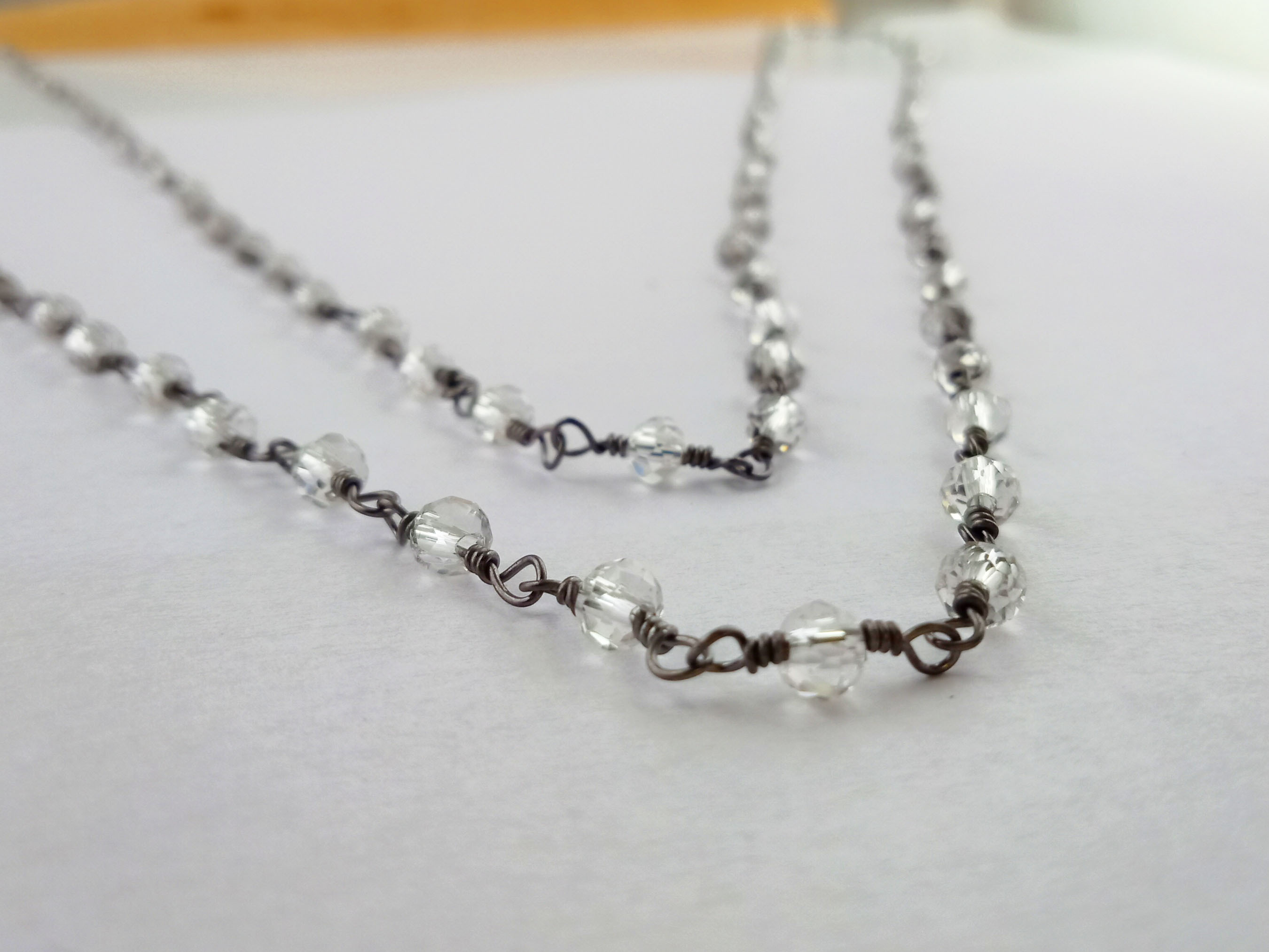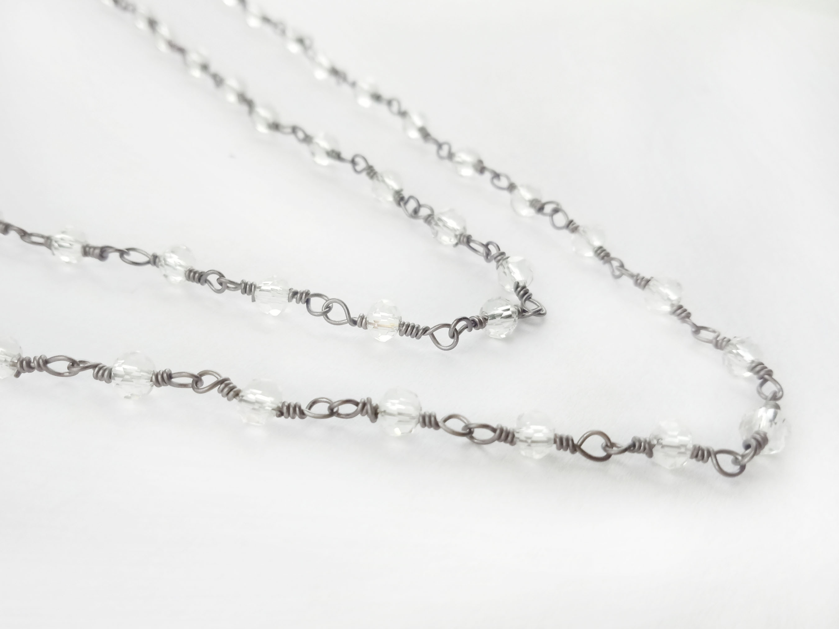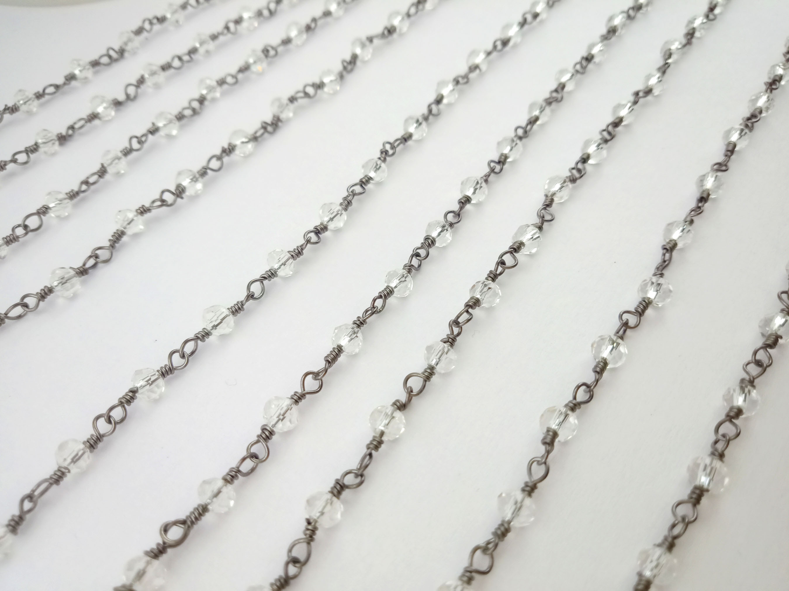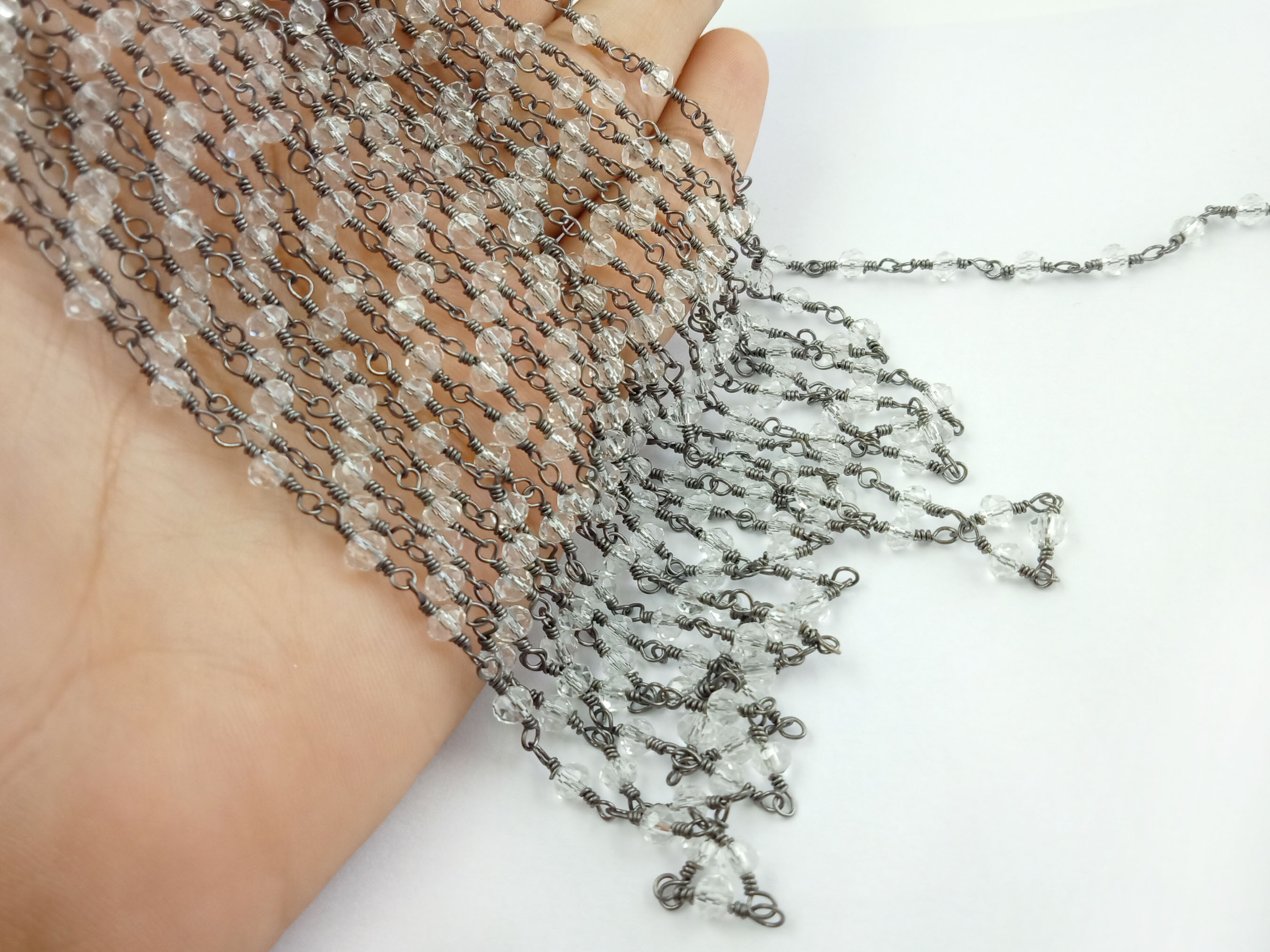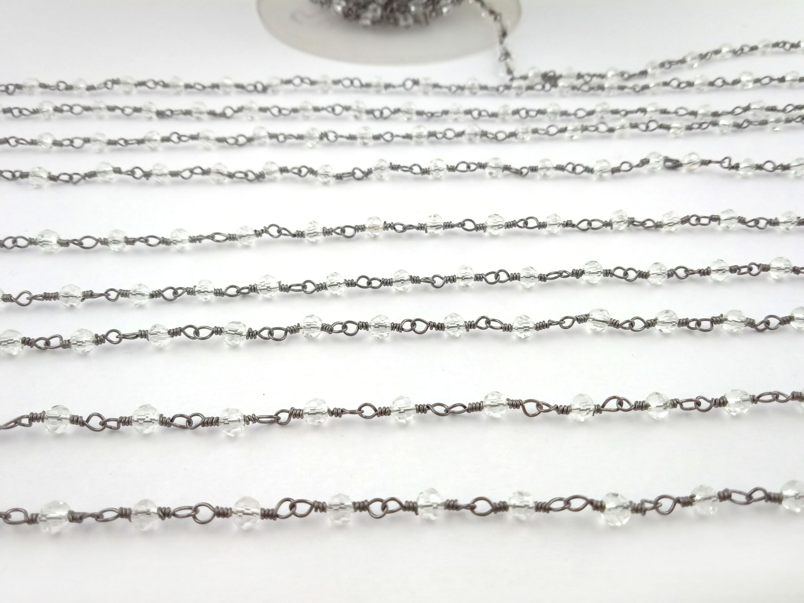 राउंड क्रिस्टल क्वार्ट्ज़ रोज़री चेन गनमेटल प्लेटिंग साइज़ 3mm वायर रैप्ड जेमस्टोन ज्वेलरी क्रिस्टल क्वार्ट्ज़ बीड रोज़री