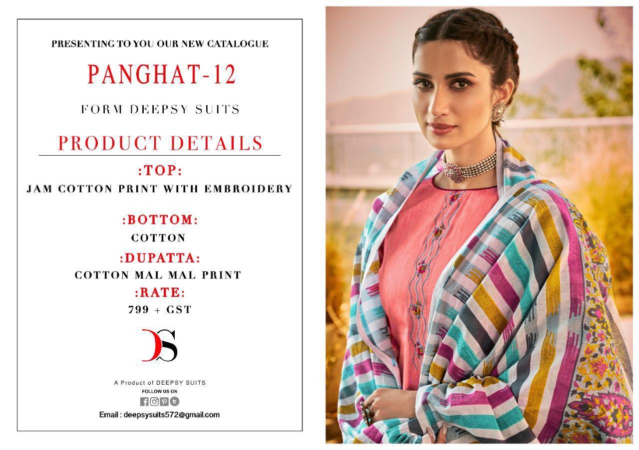 मल्टी कलर डीप्सी सूट पनघट वॉल्यूम 12 जैम कॉटन प्रिंट एम्ब्रॉयडरी वर्क ड्रेस मटेरियल कैटलॉग के साथ