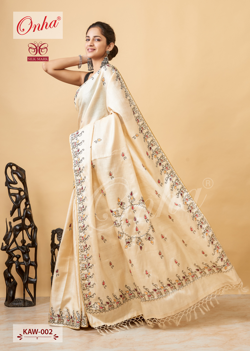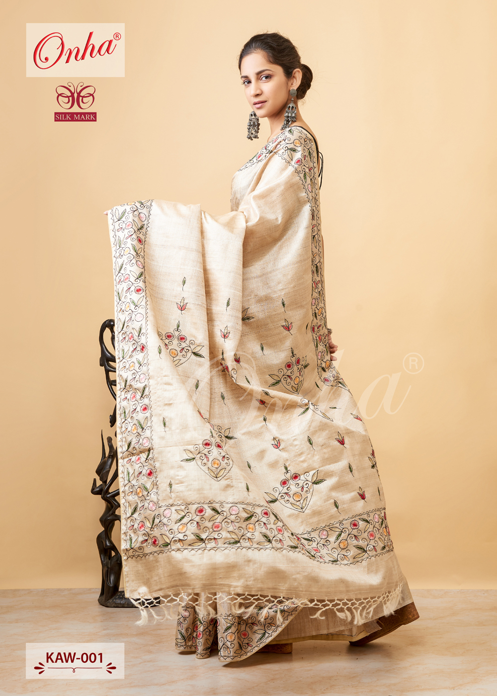 ऑफ व्हाइट देशी तुसर सिल्क हैंड एम्ब्रॉयडरी वाली साड़ी