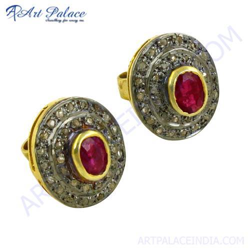 Explore in english - Designer Gold Plated Silver Cute Diamond & Ruby Stud Earrings