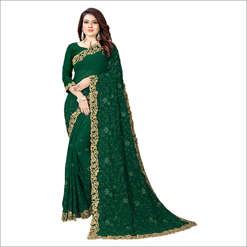 कशीदाकारी डिज़ाइनर ग्रीन जॉर्जेट साड़ी