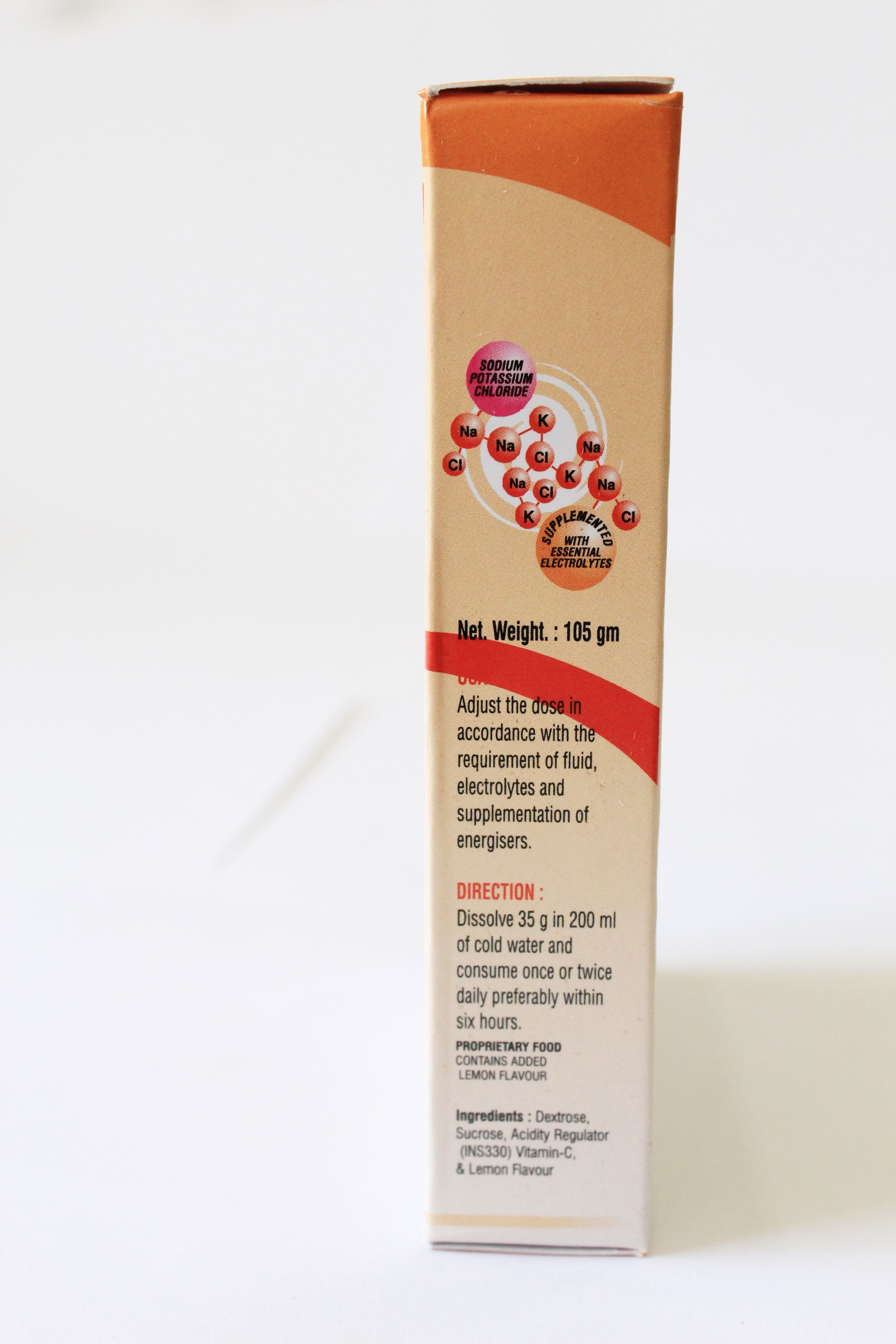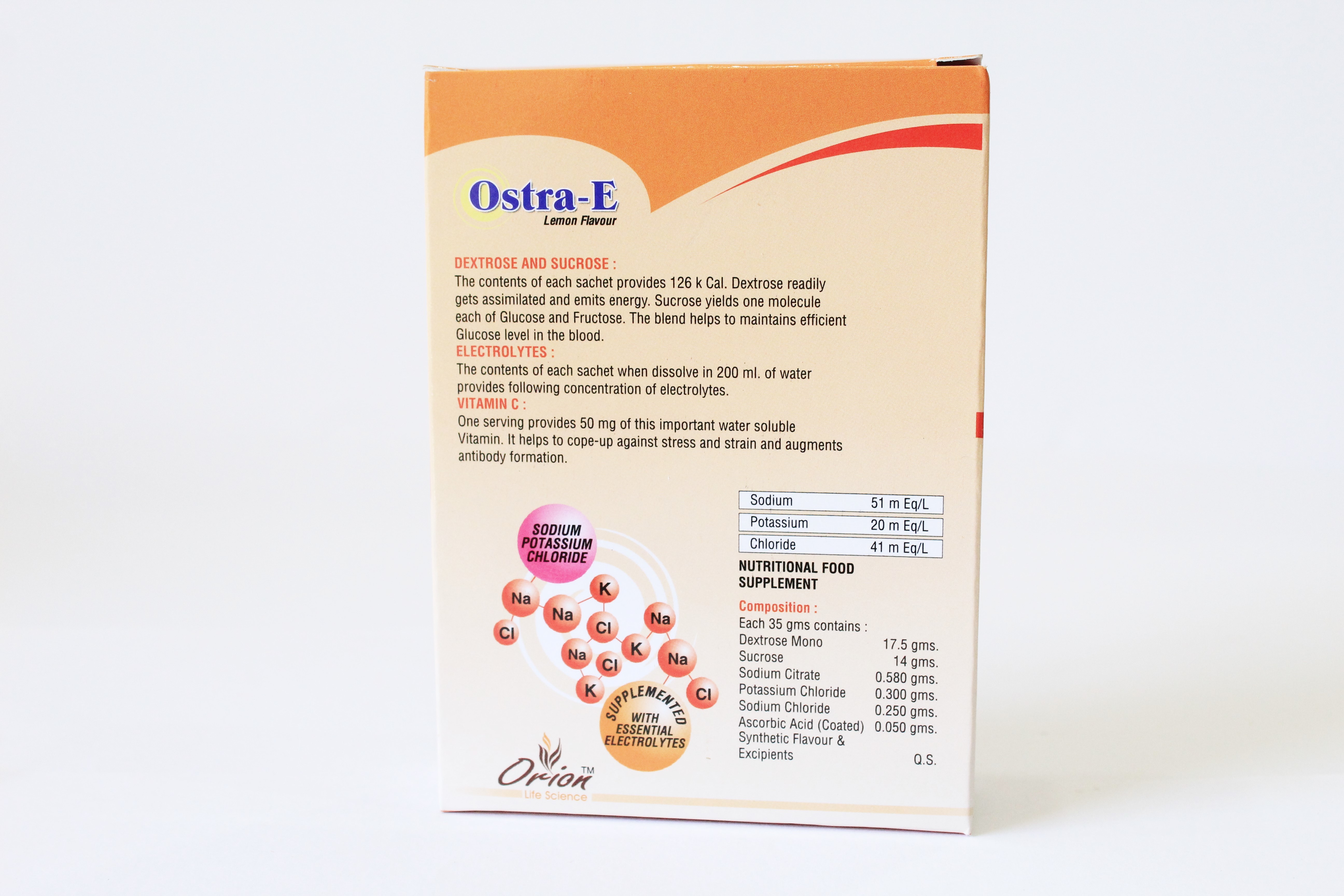 - डेक्सट्रोज़ मोनो, सुक्रोज़, सोडियम सिटारे, पोटेशियम क्लोराइड, सोडियम क्लोराइड, एस्कोरबिक एसिड.