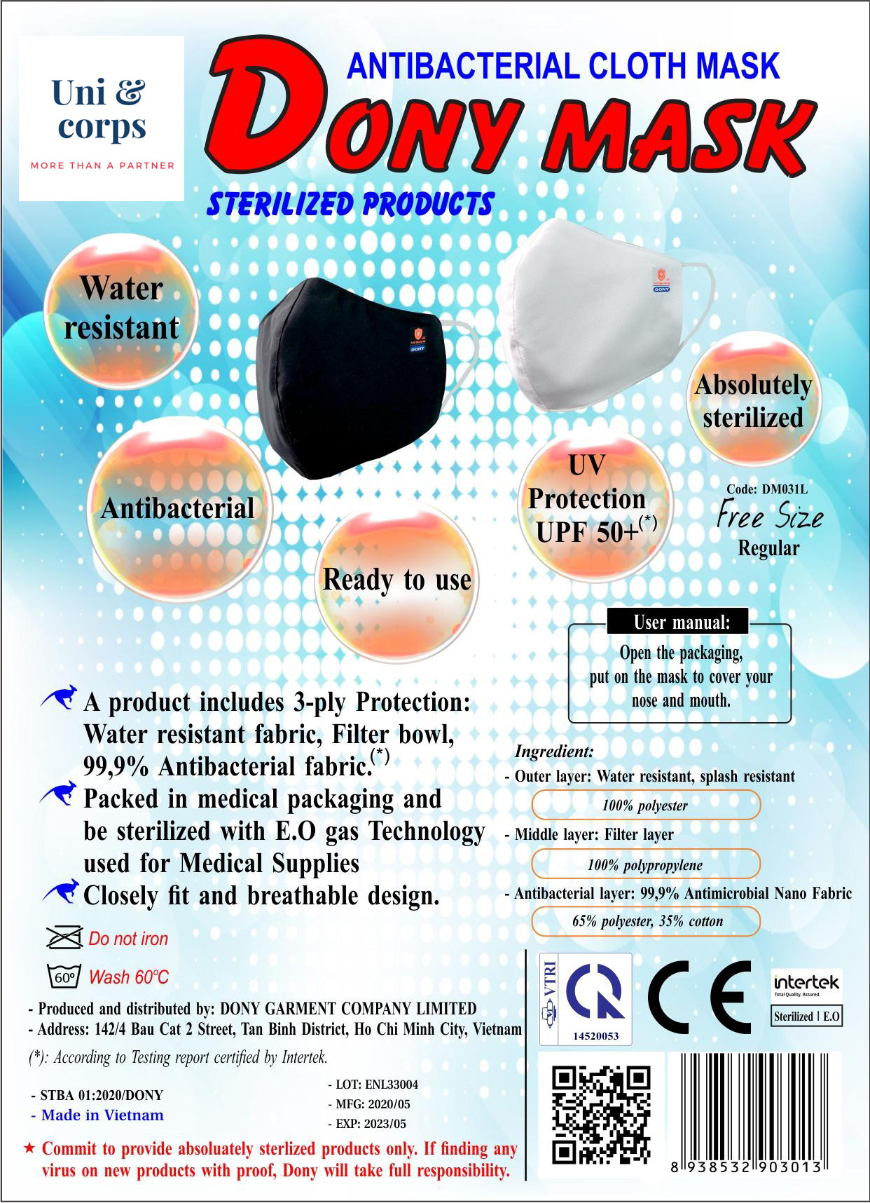 डोनी मास्क 3 प्लाई एंटीबैक्टीरियल वियतनाम क्लॉथ फेस मास्क वॉशेबल 60 टाइम्स डायरेक्ट वियतनाम फैक्ट्री