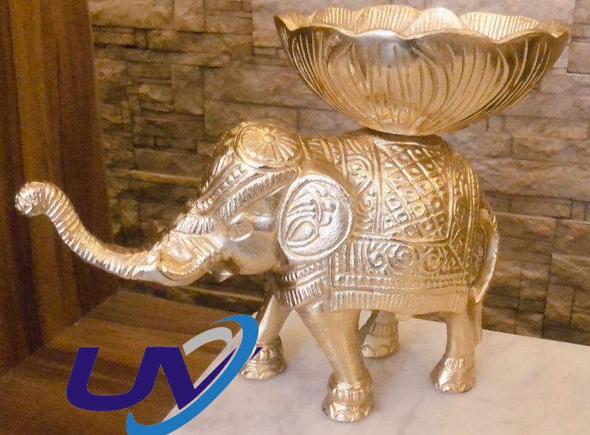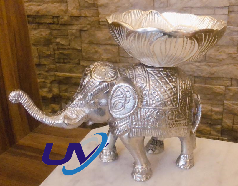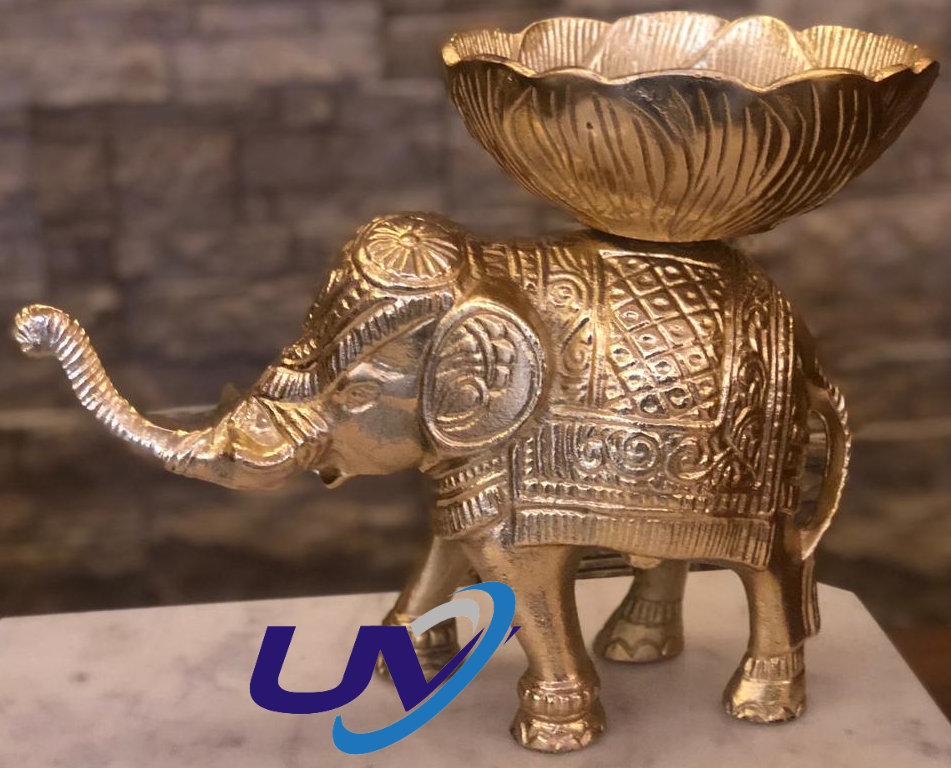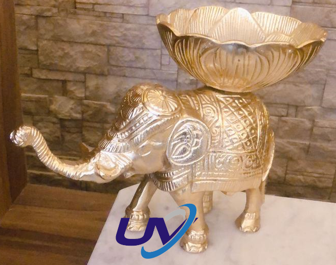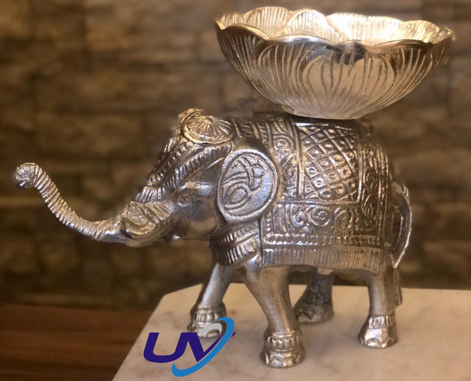 - नक्काशीदार कटोरे के साथ धातु में बने उत्कीर्ण सजावटी हाथी