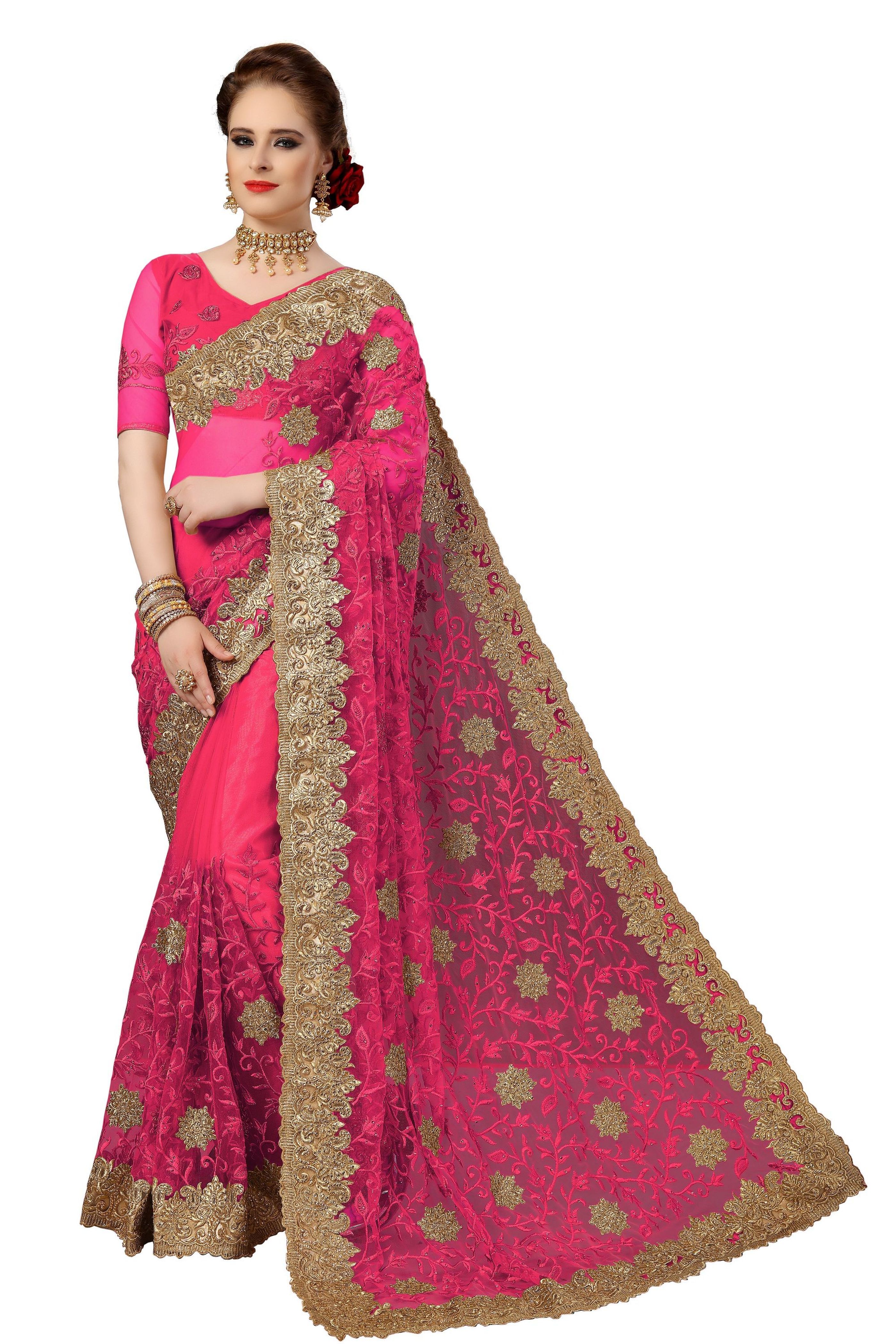 पिंक एथनिक डिज़ाइन नेट हैवी एम्ब्रॉयडरी वर्क साड़ी
