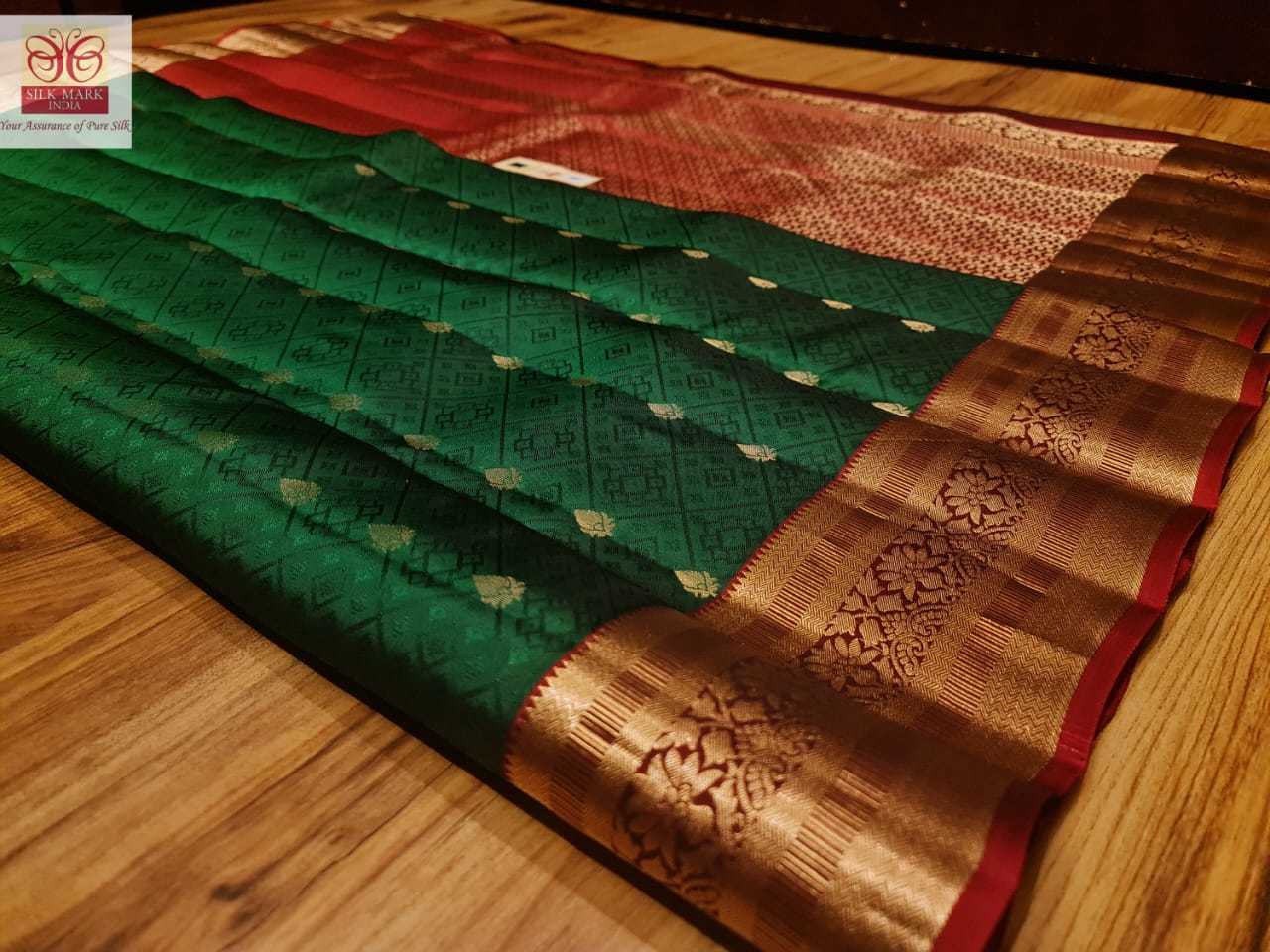 लाल फैंसी बॉर्डर कांचीपुरम सॉफ्ट सिल्क साड़ी के साथ बॉटल ग्रीन