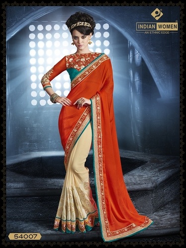 क्रीम रंग की महिलाओं की क्रश चिनोन साड़ी ब्लाउज़ और कमर बेल्ट के साथ