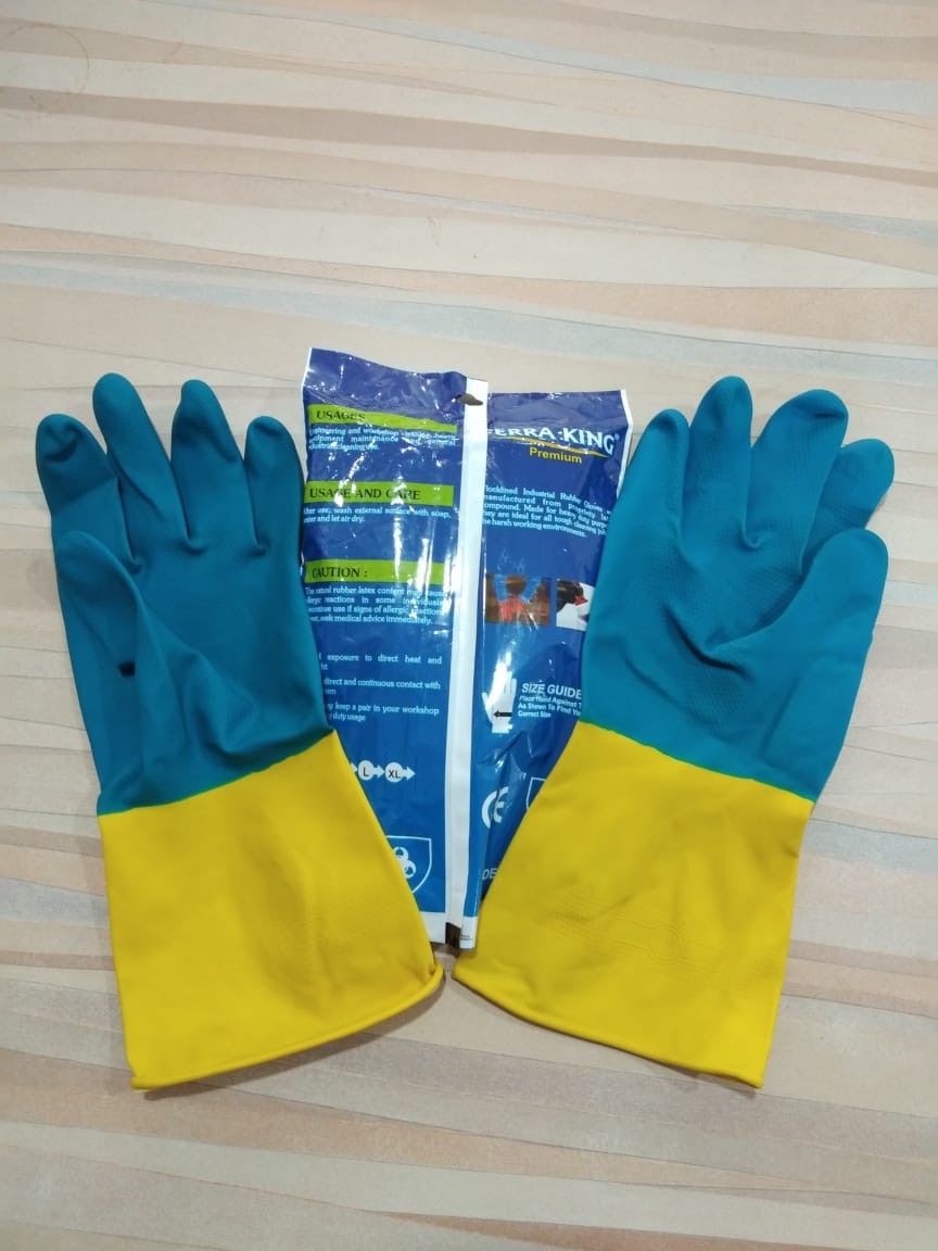 पीले और नीले रंग के फेरा किंग इंडस्ट्रियल रबर के दस्ताने