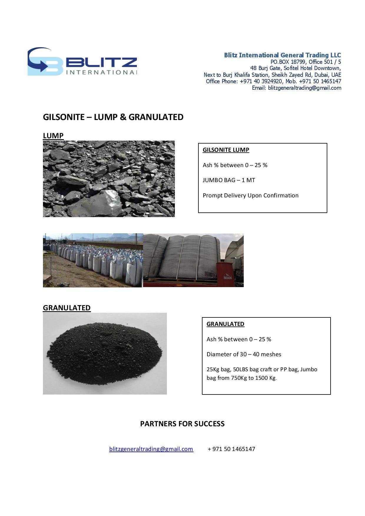 ब्लिट्ज इंटरनेशनल, 2015 में दुबई के दुबई में स्थापित, संयुक्त अरब अमीरात में खनिज और धातु का टॉप निर्माता,निर्यातक,वितरक,आपूर्तिकर्ता,व्यापार कंपनी है। ब्लिट्ज इंटरनेशनल ट्रेड इंडिया के सूचीबद्ध उत्पादों के सत्यापित और विश्वसनीय विक्रेताओं में से एक है। आपूर्ति और व्यापार के अपने व्यापक अनुभव के साथ, ब्लिट्ज इंटरनेशनल ने उच्च गुणवत्ता आदि के साथ बाजार में अपने लिए एक प्रतिष्ठित नाम बनाया है। ग्राहक केंद्रित दृष्टिकोण पर ध्यान केंद्रित करते हुए, ब्लिट्ज इंटरनेशनल की अखिल भारतीय उपस्थिति है और पूरे देश में एक विशाल उपभोक्ता आधार को पूरा करता है। ब्लिट्ज इंटरनेशनल से ट्रेड इंडिया के गुणवत्ता-सुनिश्चित उत्पादों () को थोक में खरीदें।