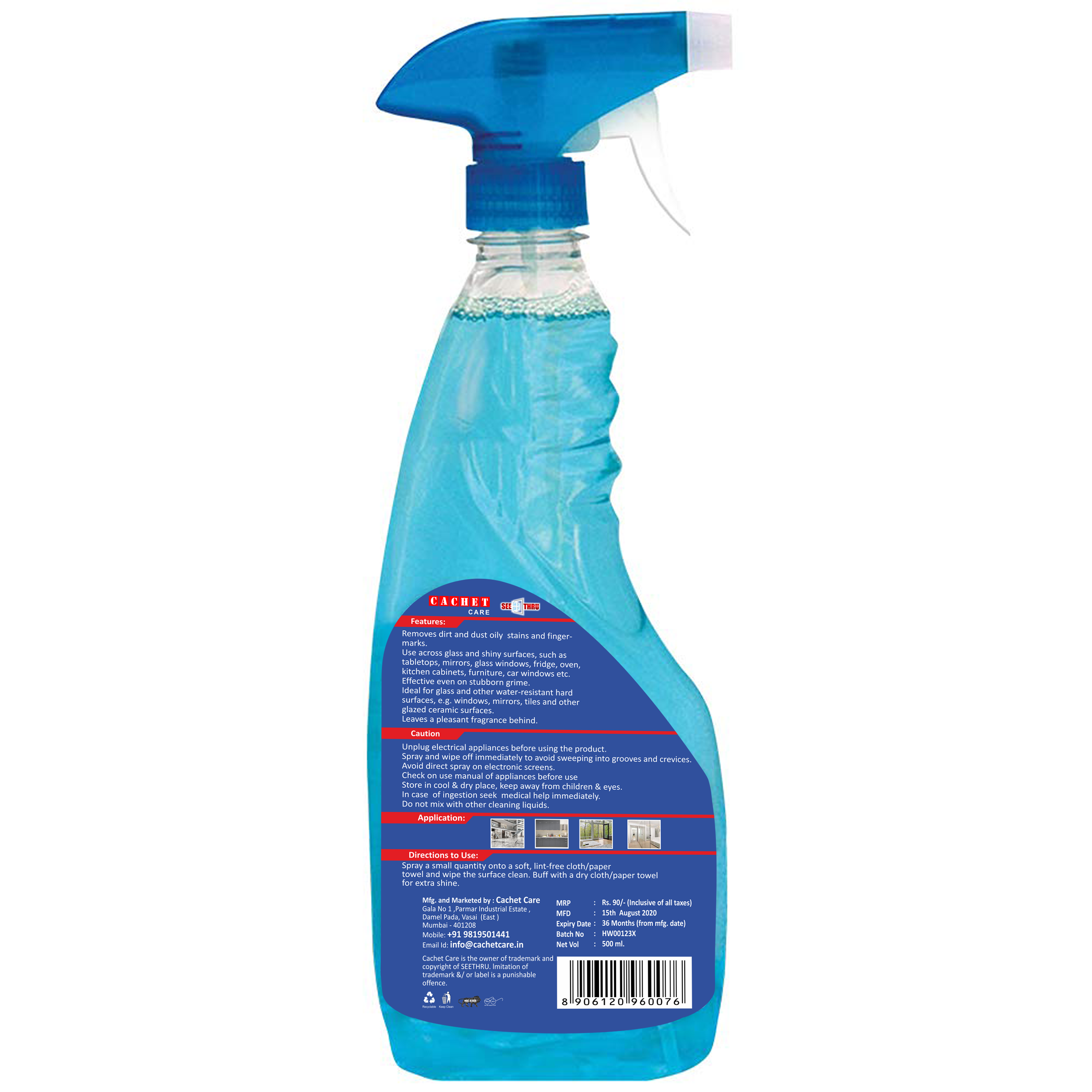 | फ़ीचर | ⢠Removes dirt and dust .You can actually see thru the other side not realizingthe glass existed. ⢠Multi-purpose glass and household cleaner which can be used on glass,Mirrors, appliances like TVs microwaves, ceramic tiles, glazed tiles, granite,etc. ⢠Excellent for glass surfaces, mirror,fridge ,oven Glass, car window, mirror, TV screen, SS, chrome, computer monitors, stainless steel, chrome,plastic. ⢠Gets rid of tough stains including grease and other cooking stains in yourkitchen. |