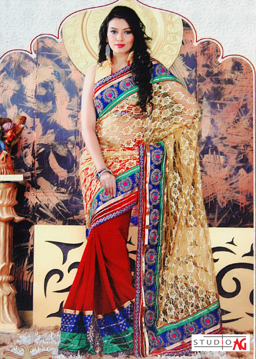 गोल्डन और रेड नेट और जॉर्जेट साड़ी