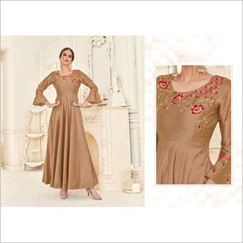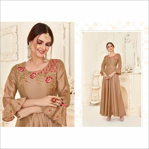 वॉशेबल सॉफ्ट टाफेटा सिल्क हैवी वर्क पार्टी वियर गोल्डन गाउन