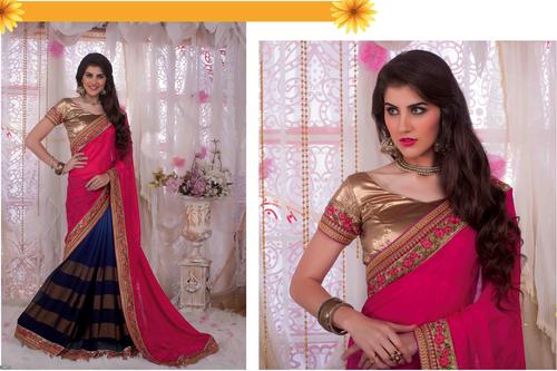 - गोल्डन नेवी गुलाबी कढ़ाई बॉर्डर साड़ी