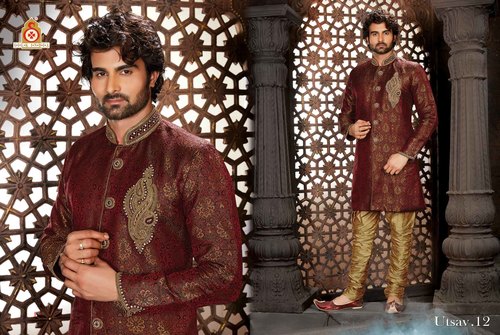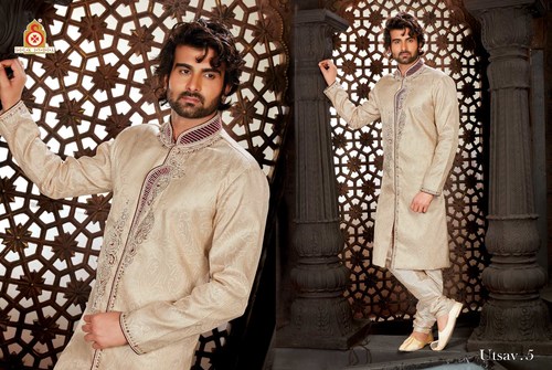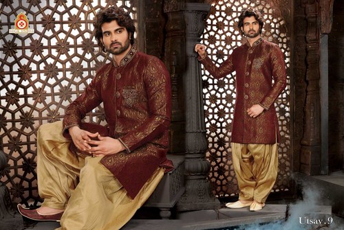 डार्क बेज और मैरून ग्रूम वियर शेरवानी