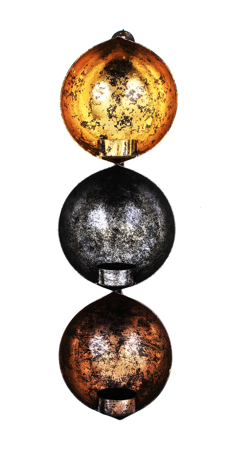 - हाथ से बने सजावटी टी लाइट धारक, जिसमें आयरनवर्क दीवार पर लटकने वाली सजावट पर सोने, चांदी और तांबे की पत्तियाँ लगी हैं।