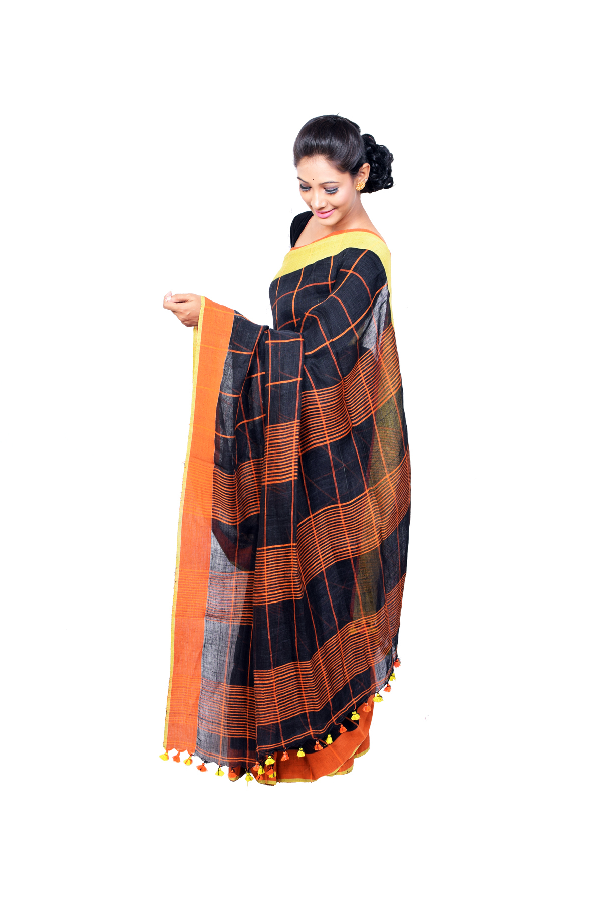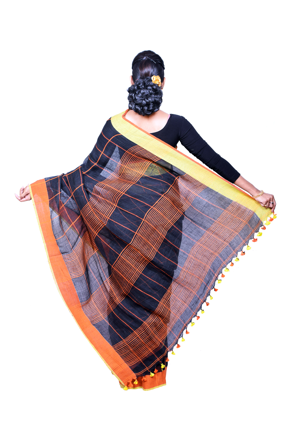 काले हाथ से बुने हुए चेक लिनन साड़ी