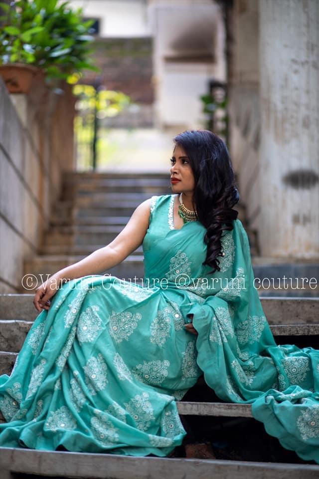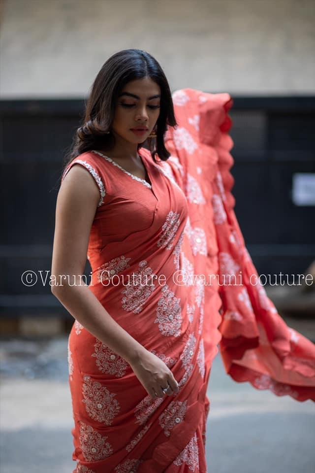 क्रीम रंग की महिलाओं की क्रश चिनोन साड़ी ब्लाउज़ और कमर बेल्ट के साथ