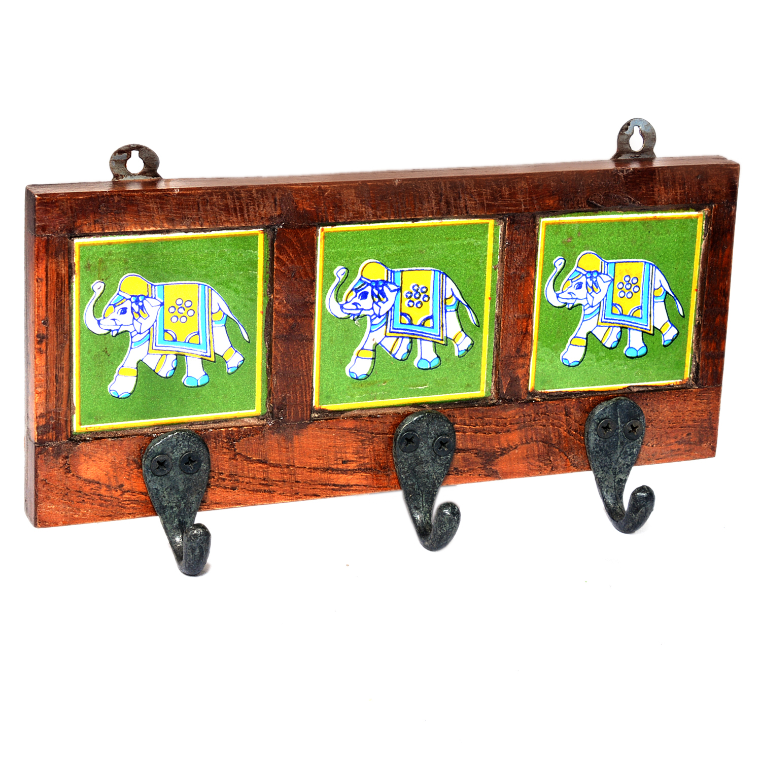 Explore in english - Indian Home Decor 3 Hook Elephant Printed Tile Wooden Wall Door Hanging